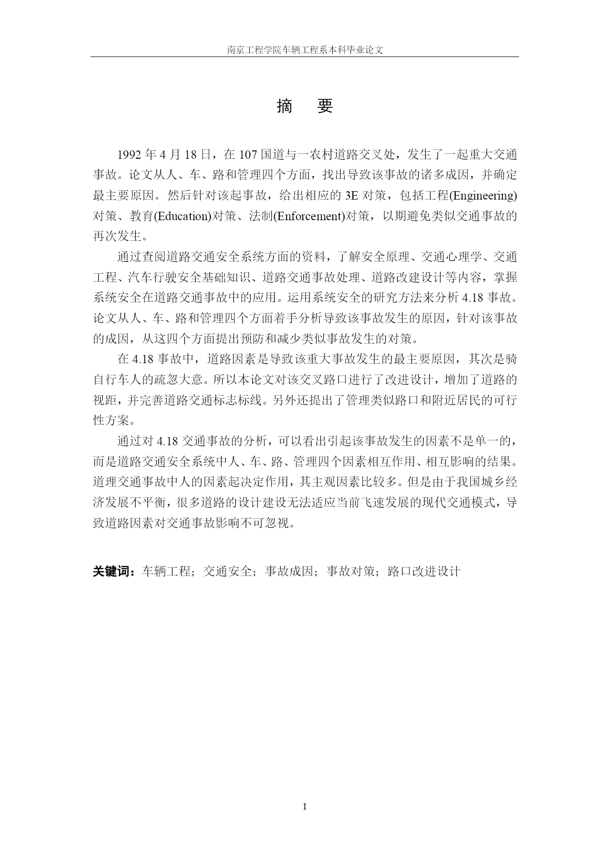 南京工程学院车辆工程系本科毕业论文PAGEII摘要1992年4月18日,在107国道与一农村道路交叉处,发生了一起重大交通事故。论文从人、车、路和管理四个方面,找出导致该事故的诸多成因,并确定最主要原因。然后针对该起事故,给出相应的3E对策,包括工程(Engineering)对策、教育(Education)对策、法制(Enforcement)对策,以期避免类似交通事故的再次发生。通过查阅道路交通安全系统方面的资料,了解安全原理、交通心理学、交通工程、汽车行驶安全基础知识、道路交通事故处理、道路改建设