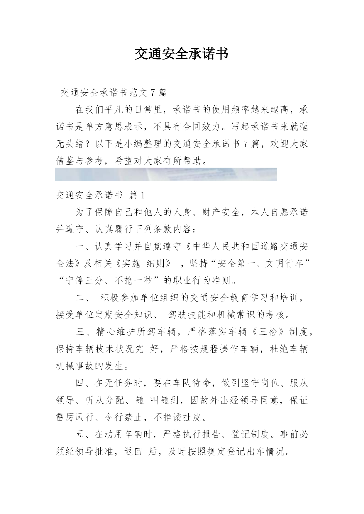 交通安全承诺书交通安全承诺书范文7篇在我们平凡的日常里,承诺书的使用频率越来越高,承诺书是单方意思表示,不具有合同效力。写起承诺书来就毫无头绪?以下是小编整理的交通安全承诺书7篇,欢迎大家借鉴与参考,希望对大家有所帮助。交通安全承诺书篇1为了保障自己和他人的人身、财产安全,本人自愿承诺并遵守、认真履行下列条款内容:一、认真学习并自觉遵守《中华人民共和国道路交通安全法》及相关《实施细则》,坚持“安全第一、文明行车”“宁停三分、不抢一秒”的职业行为准则。二、积极参加单位组织的交通安全教育学习和培训,接受单位定