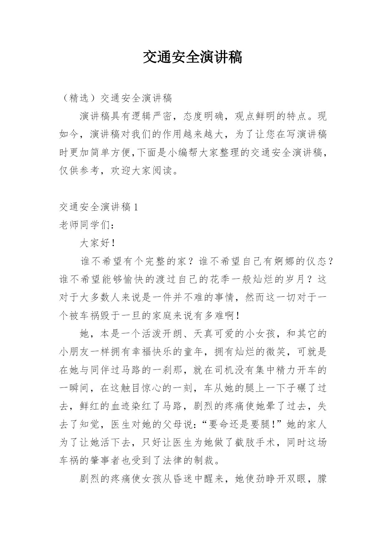 交通安全演讲稿(精选)交通安全演讲稿演讲稿具有逻辑严密,态度明确,观点鲜明的特点。现如今,演讲稿对我们的作用越来越大,为了让您在写演讲稿时更加简单方便,下面是小编帮大家整理的交通安全演讲稿,仅供参考,欢迎大家阅读。交通安全演讲稿1老师同学们:大家好!谁不希望有个完整的家?谁不希望自己有婀娜的仪态?谁不希望能够愉快的渡过自己的花季一般灿烂的岁月?这对于大多数人来说是一件并不难的事情,然而这一切对于一个被车祸毁于一旦的家庭来说有多难啊!她,本是一个活泼开朗、天真可爱的小女孩,和其它的小朋友一样拥有幸福快乐的童