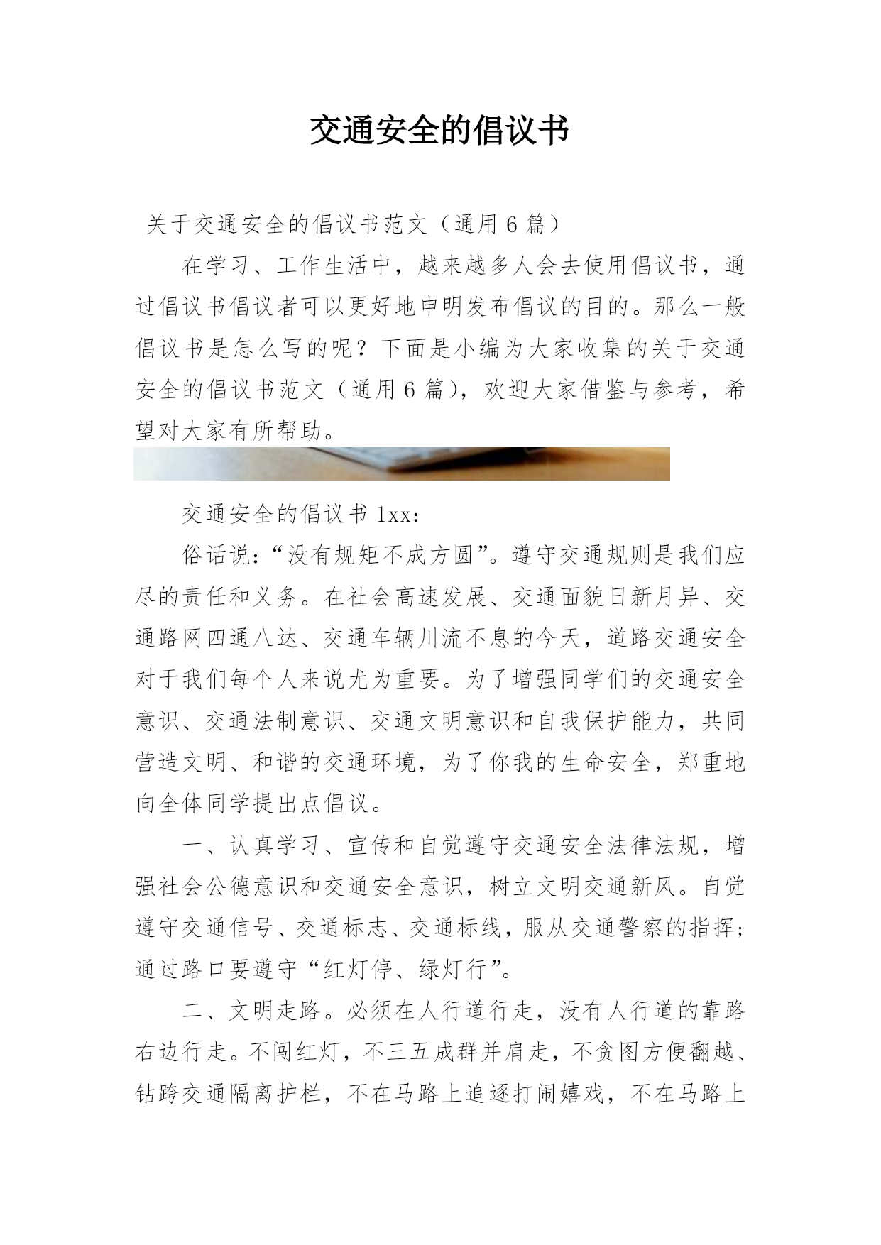 交通安全的倡议书关于交通安全的倡议书范文(通用6篇)在学习、工作生活中,越来越多人会去使用倡议书,通过倡议书倡议者可以更好地申明发布倡议的目的。那么一般倡议书是怎么写的呢?下面是小编为大家收集的关于交通安全的倡议书范文(通用6篇),欢迎大家借鉴与参考,希望对大家有所帮助。交通安全的倡议书1xx:俗话说:“没有规矩不成方圆”。遵守交通规则是我们应尽的责任和义务。在社会高速发展、交通面貌日新月异、交通路网四通八达、交通车辆川流不息的今天,道路交通安全对于我们每个人来说尤为重要。为了增强同学们的交通安全意识、交