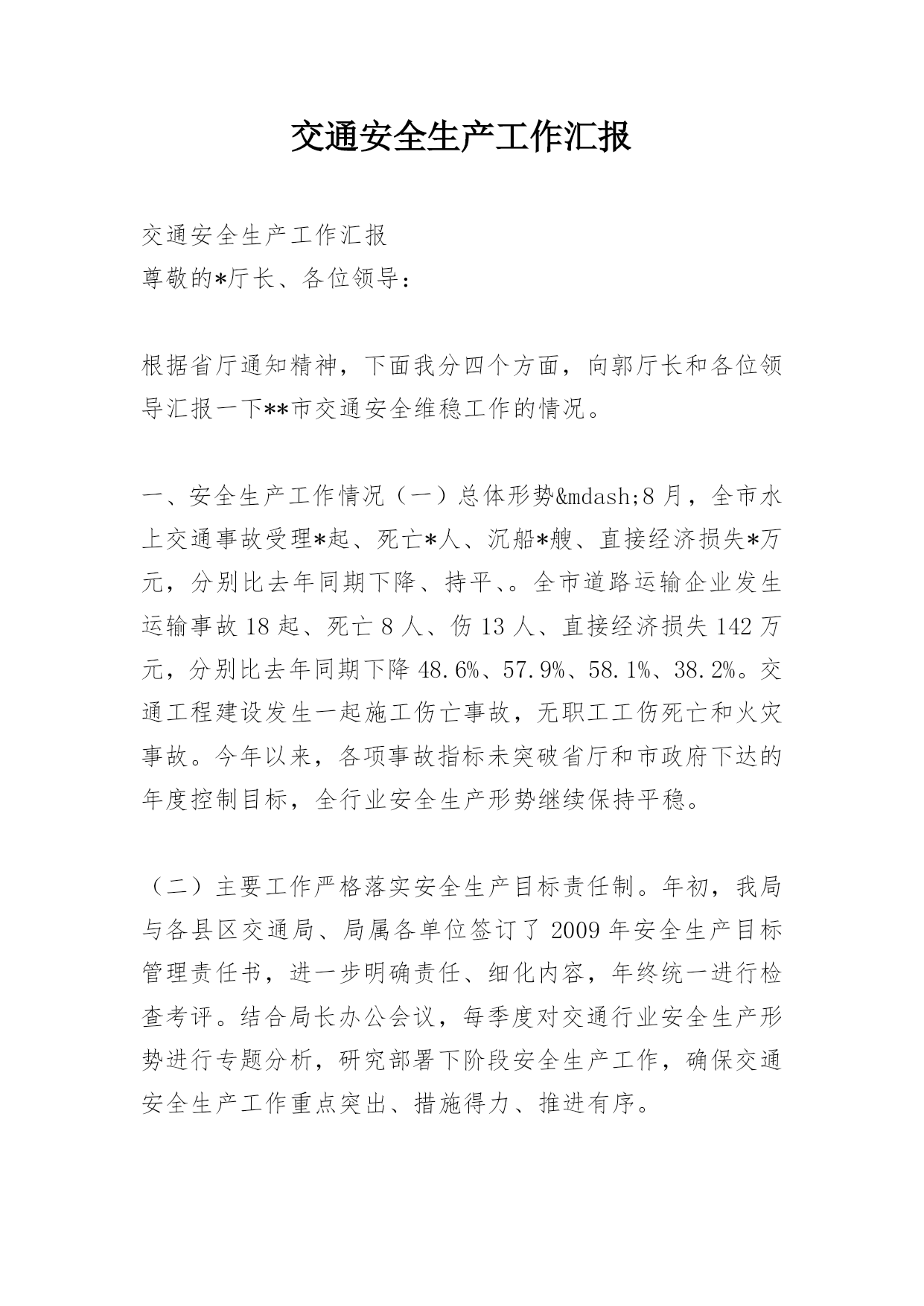 交通安全生产工作汇报交通安全生产工作汇报尊敬的*厅长、各位领导:根据省厅通知精神,下面我分四个方面,向郭厅长和各位领导汇报一下**市交通安全维稳工作的情况。一、安全生产工作情况(一)总体形势—8月,全市水上交通事故受理*起、死亡*人、沉船*艘、直接经济损失*万元,分别比去年同期下降、持平、。全市道路运输企业发生运输事故18起、死亡8人、伤13人、直接经济损失142万元,分别比去年同期下降48.6%、57.9%、58.1%、38.2%。交通工程建设发生一起施工伤亡事故,无职工工伤死亡和火灾事故。