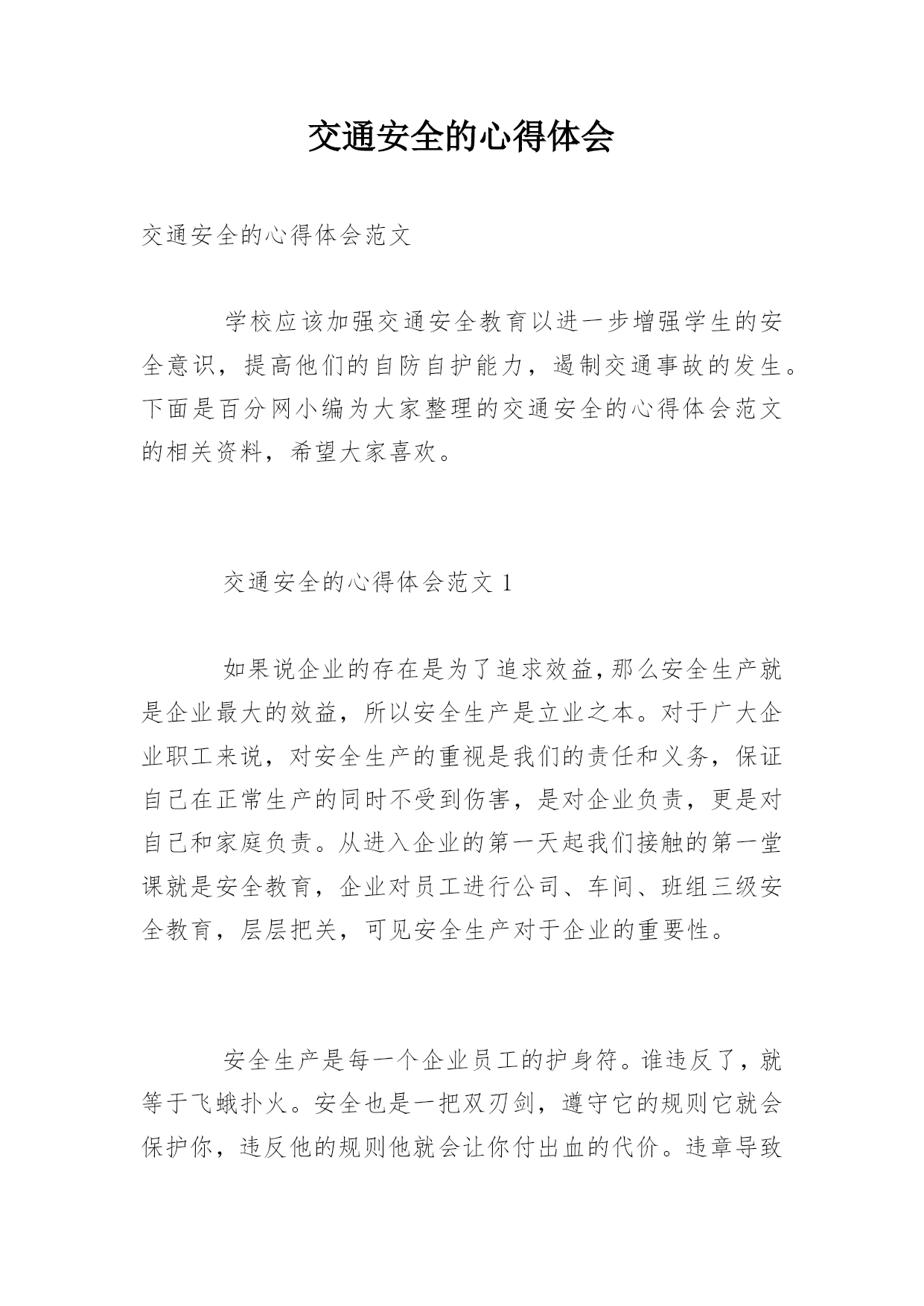 交通安全的心得体会交通安全的心得体会范文学校应该加强交通安全教育以进一步增强学生的安全意识,提高他们的自防自护能力,遏制交通事故的发生。下面是百分网小编为大家整理的交通安全的心得体会范文的相关资料,希望大家喜欢。交通安全的心得体会范文1如果说企业的存在是为了追求效益,那么安全生产就是企业最大的效益,所以安全生产是立业之本。对于广大企业职工来说,对安全生产的重视是我们的责任和义务,保证自己在正常生产的同时不受到伤害,是对企业负责,更是对自己和家庭负责。从进入企业的第一天起我们接触的第一堂课就是安全教育,企业