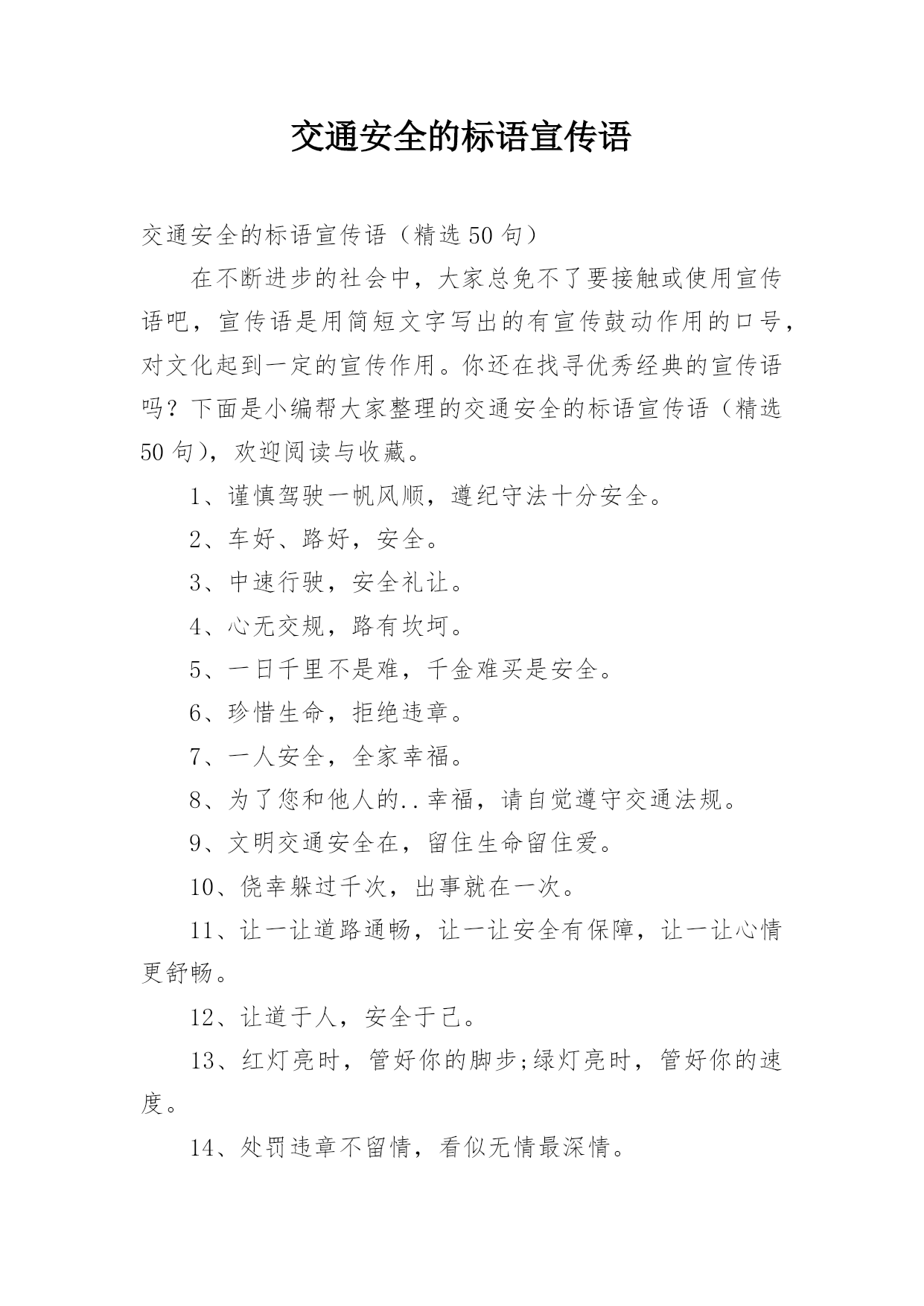 交通安全的标语宣传语交通安全的标语宣传语(精选50句)在不断进步的社会中,大家总免不了要接触或使用宣传语吧,宣传语是用简短文字写出的有宣传鼓动作用的口号,对文化起到一定的宣传作用。你还在找寻优秀经典的宣传语吗?下面是小编帮大家整理的交通安全的标语宣传语(精选50句),欢迎阅读与收藏。1、谨慎驾驶一帆风顺,遵纪守法十分安全。2、车好、路好,安全。3、中速行驶,安全礼让。4、心无交规,路有坎坷。5、一日千里不是难,千金难买是安全。6、珍惜生命,拒绝违章。7、一人安全,全家幸福。8、为了您和他人的..幸福,请自