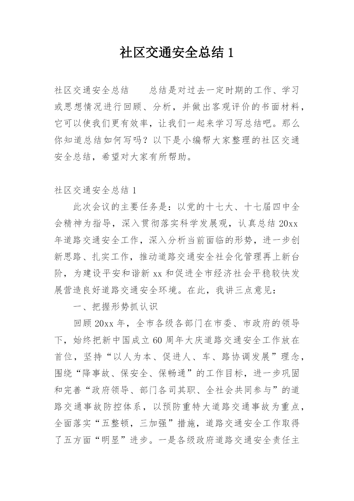 社区交通安全总结1社区交通安全总结总结是对过去一定时期的工作、学习或思想情况进行回顾、分析,并做出客观评价的书面材料,它可以使我们更有效率,让我们一起来学习写总结吧。那么你知道总结如何写吗?以下是小编帮大家整理的社区交通安全总结,希望对大家有所帮助。社区交通安全总结1此次会议的主要任务是:以党的十七大、十七届四中全会精神为指导,深入贯彻落实科学发展观,认真总结20xx年道路交通安全工作,深入分析当前面临的形势,进一步创新思路、扎实工作,推动道路交通安全社会化管理再上新台阶,为建设平安和谐新xx和促进全市经