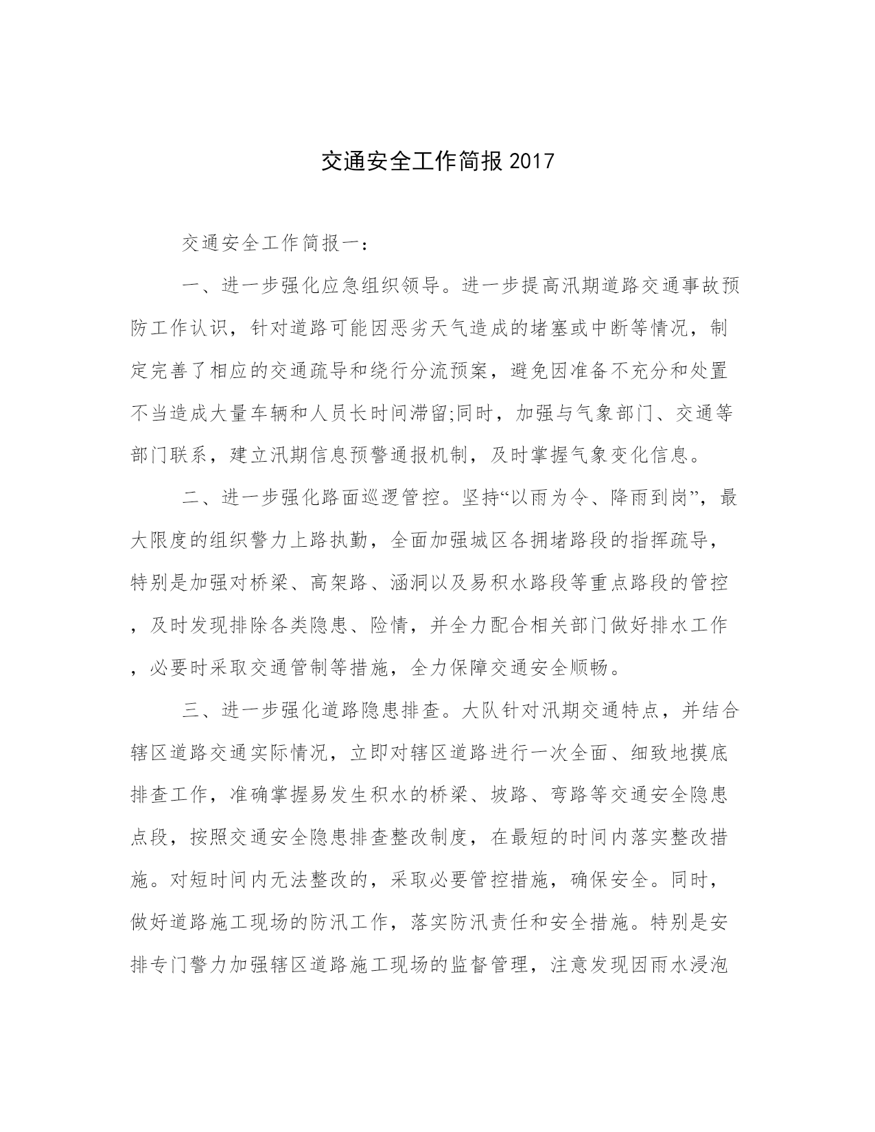 交通安全工作简报2017交通安全工作简报一:一、进一步强化应急组织领导。进一步提高汛期道路交通事故预防工作认识,针对道路可能因恶劣天气造成的堵塞或中断等情况,制定完善了相应的交通疏导和绕行分流预案,避免因准备不充分和处置不当造成大量车辆和人员长时间滞留;同时,加强与气象部门、交通等部门联系,建立汛期信息预警通报机制,及时掌握气象变化信息。二、进一步强化路面巡逻管控。坚持“以雨为令、降雨到岗”,最大限度的组织警力上路执勤,全面加强城区各拥堵路段的指挥疏导,特别是加强对桥梁、高架路、涵洞以及易积水路段等重点路
