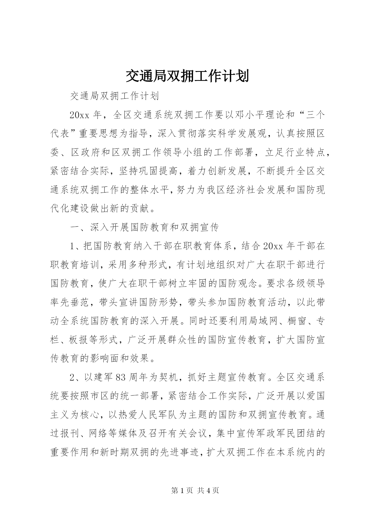 第PAGE\*Arabic\*MERGEFORMAT4页共NUMPAGES\*MERGEFORMAT4页交通局双拥工作计划交通局双拥工作计划20xx年,全区交通系统双拥工作要以邓小平理论和“三个代表”重要思想为指导,深入贯彻落实科学发展观,认真按照区委、区政府和区双拥工作领导小组的工作部署,立足行业特点,紧密结合实际,坚持巩固提高,着力创新发展,不断提升全区交通系统双拥工作的整体水平,努力为我区经济社会发展和国防现代化建设做出新的贡献。一、深入开展国防教育和双拥宣传1、把国防教育纳入干部在职教