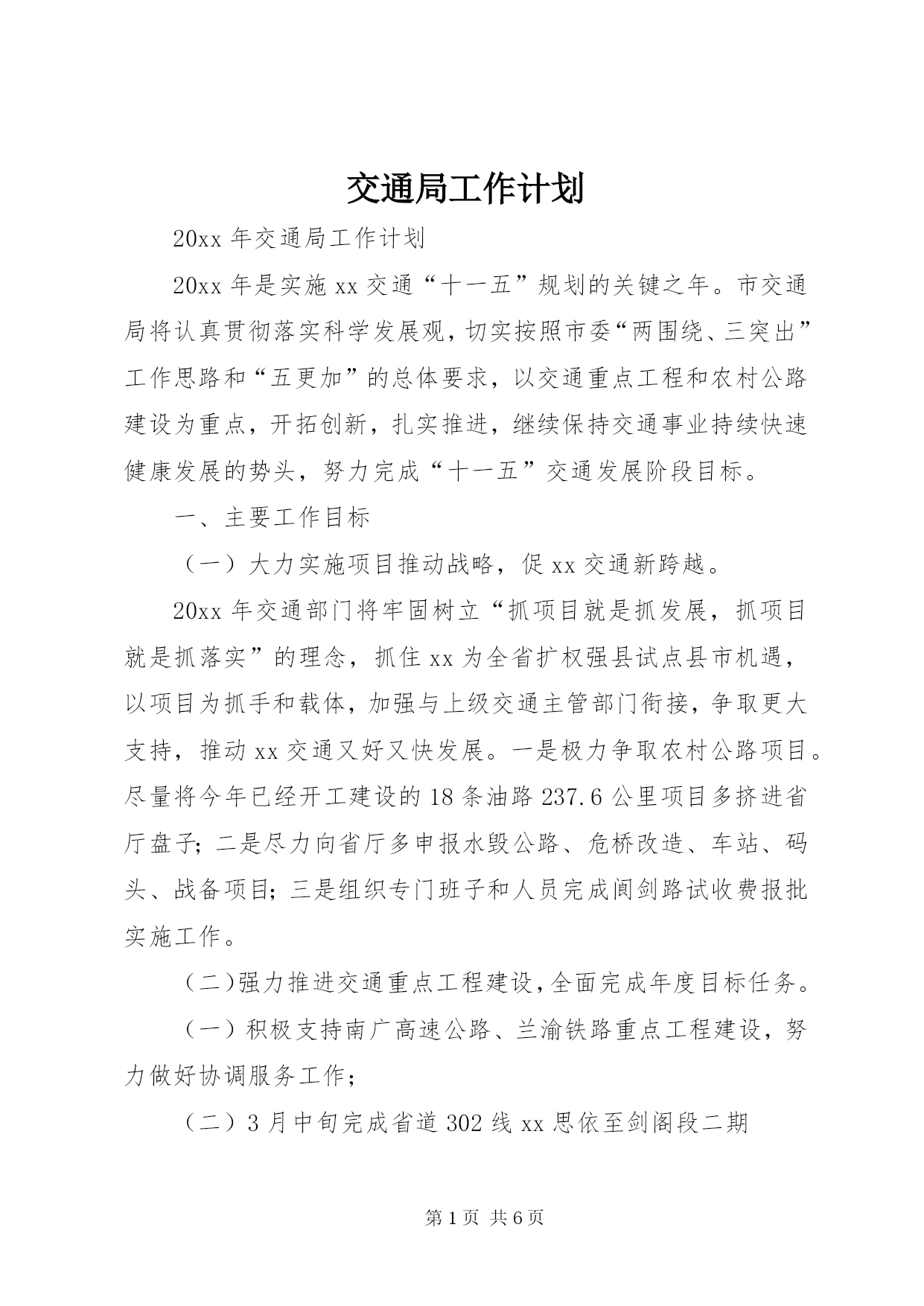 第PAGE\*Arabic\*MERGEFORMAT6页共NUMPAGES\*MERGEFORMAT6页交通局工作计划20xx年交通局工作计划20xx年是实施xx交通“十一五”规划的关键之年。市交通局将认真贯彻落实科学发展观,切实按照市委“两围绕、三突出”工作思路和“五更加”的总体要求,以交通重点工程和农村公路建设为重点,开拓创新,扎实推进,继续保持交通事业持续快速健康发展的势头,努力完成“十一五”交通发展阶段目标。一、主要工作目标(一)大力实施项目推动战略,促xx交通新跨越。20xx年交通部
