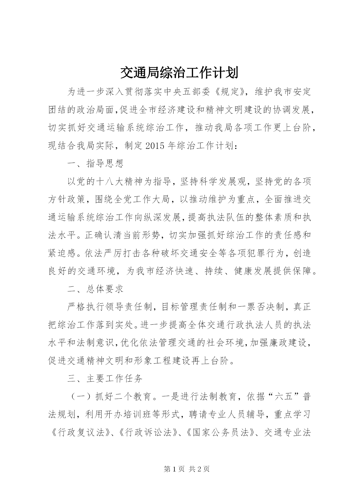 第PAGE\*Arabic\*MERGEFORMAT2页共NUMPAGES\*MERGEFORMAT2页交通局综治工作计划为进一步深入贯彻落实中央五部委《规定》,维护我市安定团结的政治局面,促进全市经济建设和精神文明建设的协调发展,切实抓好交通运输系统综治工作,推动我局各项工作更上台阶,现结合我局实际,制定2015年综治工作计划:一、指导思想以党的十八大精神为指导,坚持科学发展观,坚持党的各项方针政策,围绕全党工作大局,以推动维护为重点,全面推进交通运输系统综治工作向纵深发展,提高执法队伍的整