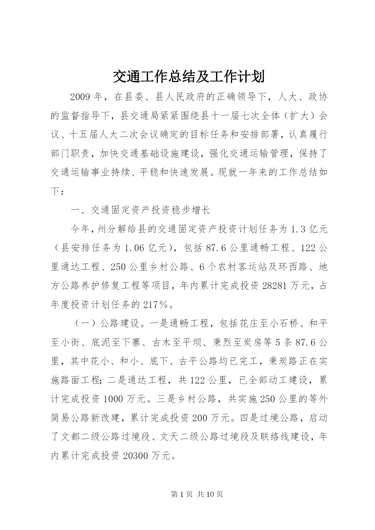 第PAGE\*Arabic\*MERGEFORMAT10页共NUMPAGES\*MERGEFORMAT10页交通工作总结及工作计划2009年,在县委、县人民政府的正确领导下,人大、政协的监督指导下,县交通局紧紧围绕县十一届七次全体(扩大)会议、十五届人大二次会议确定的目标任务和安排部署,认真履行部门职责,加快交通基础设施建设,强化交通运输管理,保持了交通运输事业持续、平稳和快速发展。现就一年来的工作总结如下:一、交通固定资产投资稳步增长今年,州分解给县的交通固定资产投资计划任务为1.3亿元(县