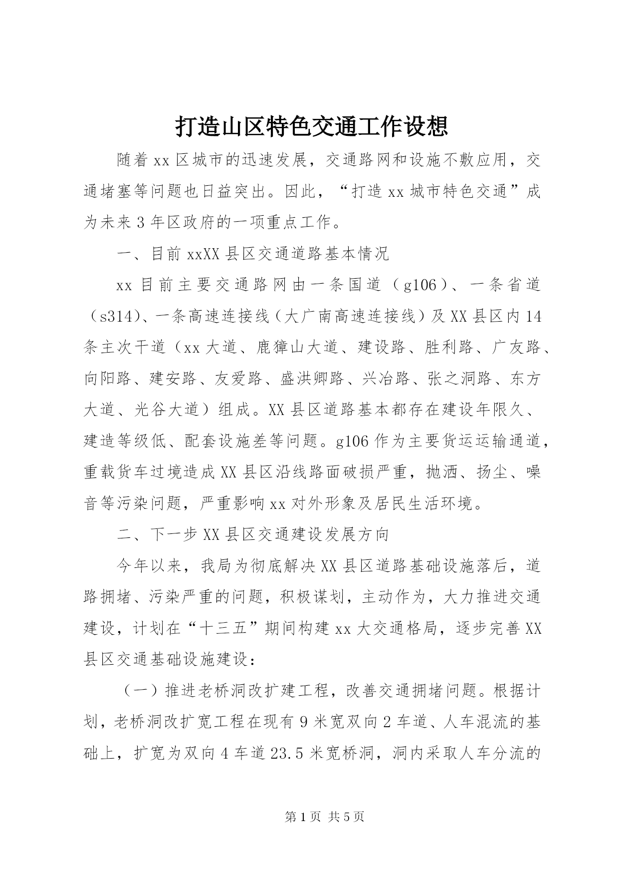 第PAGE\*Arabic\*MERGEFORMAT5页共NUMPAGES\*MERGEFORMAT5页打造山区特色交通工作设想随着xx区城市的迅速发展,交通路网和设施不敷应用,交通堵塞等问题也日益突出。因此,“打造xx城市特色交通”成为未来3年区政府的一项重点工作。一、目前xxXX县区交通道路基本情况xx目前主要交通路网由一条国道(g106)、一条省道(s314)、一条高速连接线(大广南高速连接线)及XX县区内14条主次干道(xx大道、鹿獐山大道、建设路、胜利路、广友路、向阳路、建安路、友爱
