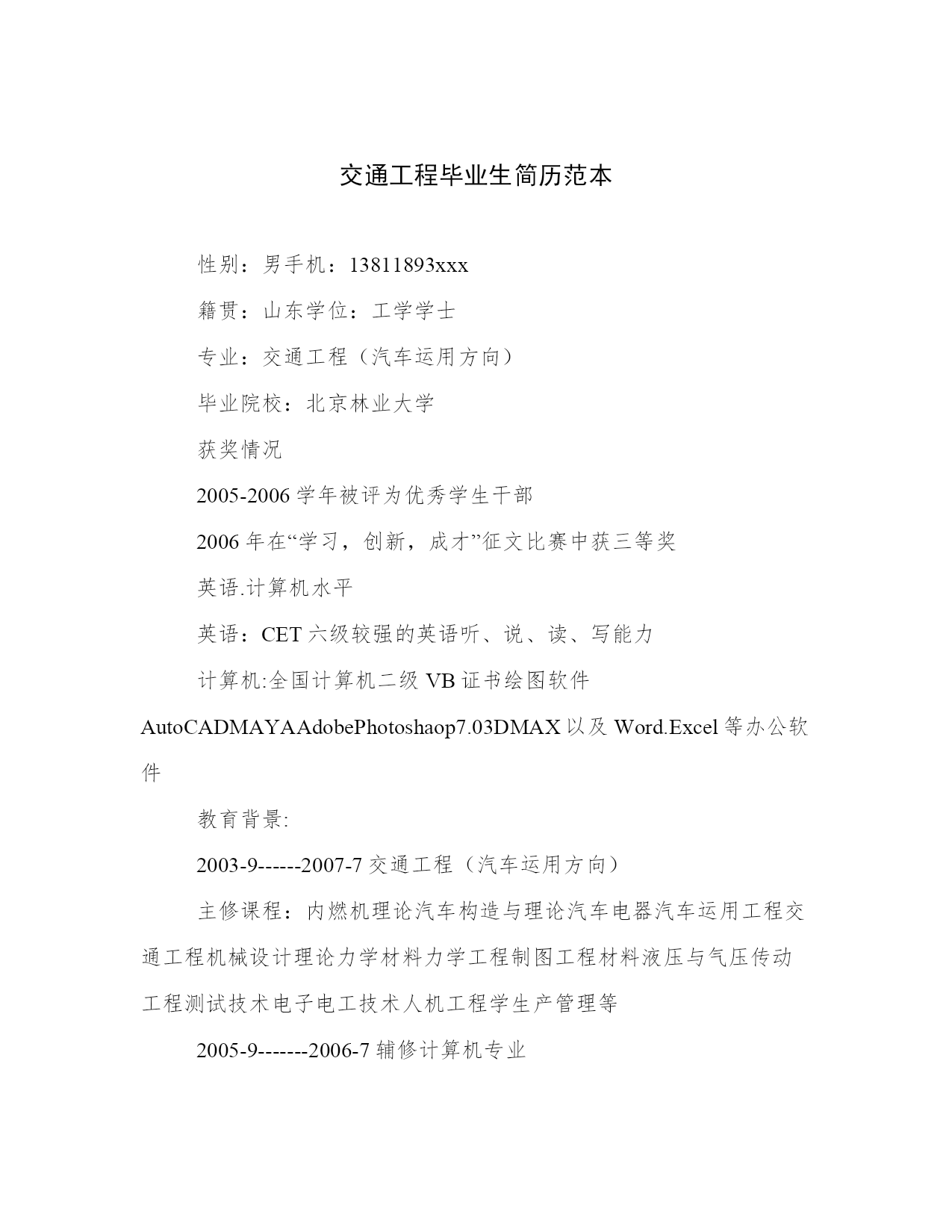 交通工程毕业生简历范本性别:男手机:13811893xxx籍贯:山东学位:工学学士专业:交通工程(汽车运用方向)毕业院校:北京林业大学获奖情况2005-2006学年被评为优秀学生干部2006年在“学习,创新,成才”征文比赛中获三等奖英语.计算机水平英语:CET六级较强的英语听、说、读、写能力计算机:全国计算机二级VB证书绘图软件AutoCADMAYAAdobePhotoshaop7.03DMAX以及Word.Excel等办公软件教育背景:2003-9------2007-7交通工程(汽车运用方向)主修课程