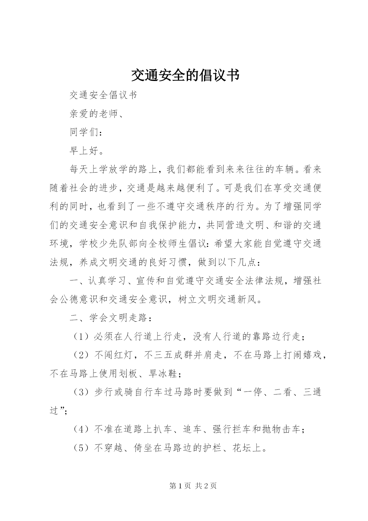 第PAGE\*Arabic\*MERGEFORMAT2页共NUMPAGES\*MERGEFORMAT2页交通安全的倡议书交通安全倡议书亲爱的老师、同学们:早上好。每天上学放学的路上,我们都能看到来来往往的车辆。看来随着社会的进步,交通是越来越便利了。可是我们在享受交通便利的同时,也看到了一些不遵守交通秩序的行为。为了增强同学们的交通安全意识和自我保护能力,共同营造文明、和谐的交通环境,学校少先队部向全校师生倡议:希望大家能自觉遵守交通法规,养成文明交通的良好习惯,做到以下几点:一、认真学习、宣