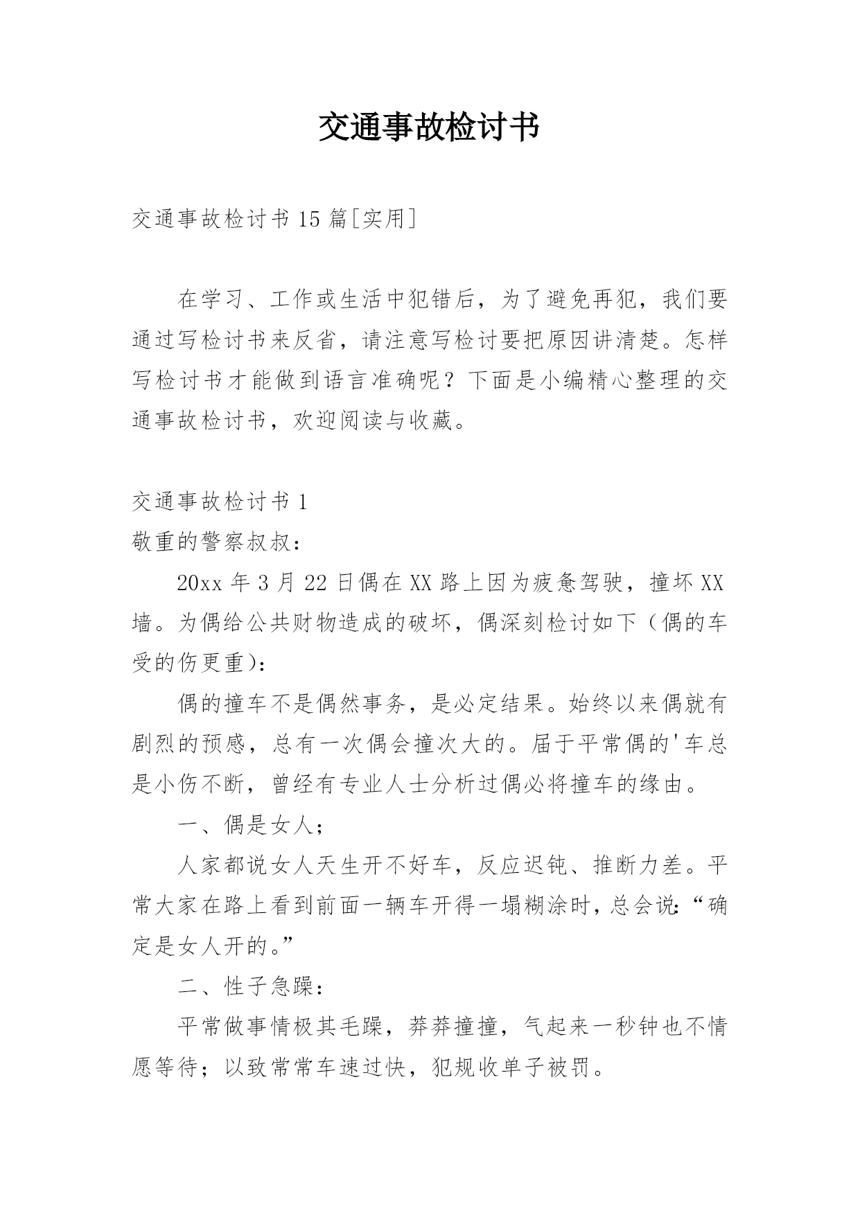 交通事故检讨书交通事故检讨书15篇[实用]在学习、工作或生活中犯错后,为了避免再犯,我们要通过写检讨书来反省,请注意写检讨要把原因讲清楚。怎样写检讨书才能做到语言准确呢?下面是小编精心整理的交通事故检讨书,欢迎阅读与收藏。交通事故检讨书1敬重的警察叔叔:20xx年3月22日偶在XX路上因为疲惫驾驶,撞坏XX墙。为偶给公共财物造成的破坏,偶深刻检讨如下(偶的车受的伤更重):偶的撞车不是偶然事务,是必定结果。始终以来偶就有剧烈的预感,总有一次偶会撞次大的。届于平常偶的'车总是小伤不断,曾经有专业人士分析过偶必