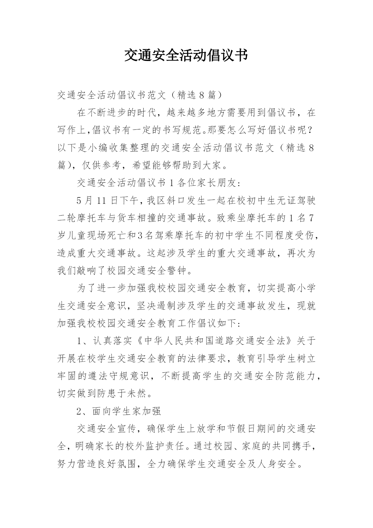 交通安全活动倡议书交通安全活动倡议书范文(精选8篇)在不断进步的时代,越来越多地方需要用到倡议书,在写作上,倡议书有一定的书写规范。那要怎么写好倡议书呢?以下是小编收集整理的交通安全活动倡议书范文(精选8篇),仅供参考,希望能够帮助到大家。交通安全活动倡议书1各位家长朋友:5月11日下午,我区斜口发生一起在校初中生无证驾驶二轮摩托车与货车相撞的交通事故。致乘坐摩托车的1名7岁儿童现场死亡和3名驾乘摩托车的初中学生不同程度受伤,造成重大交通事故。这起涉及学生的重大交通事故,再次为我们敲响了校园交通安全警钟。