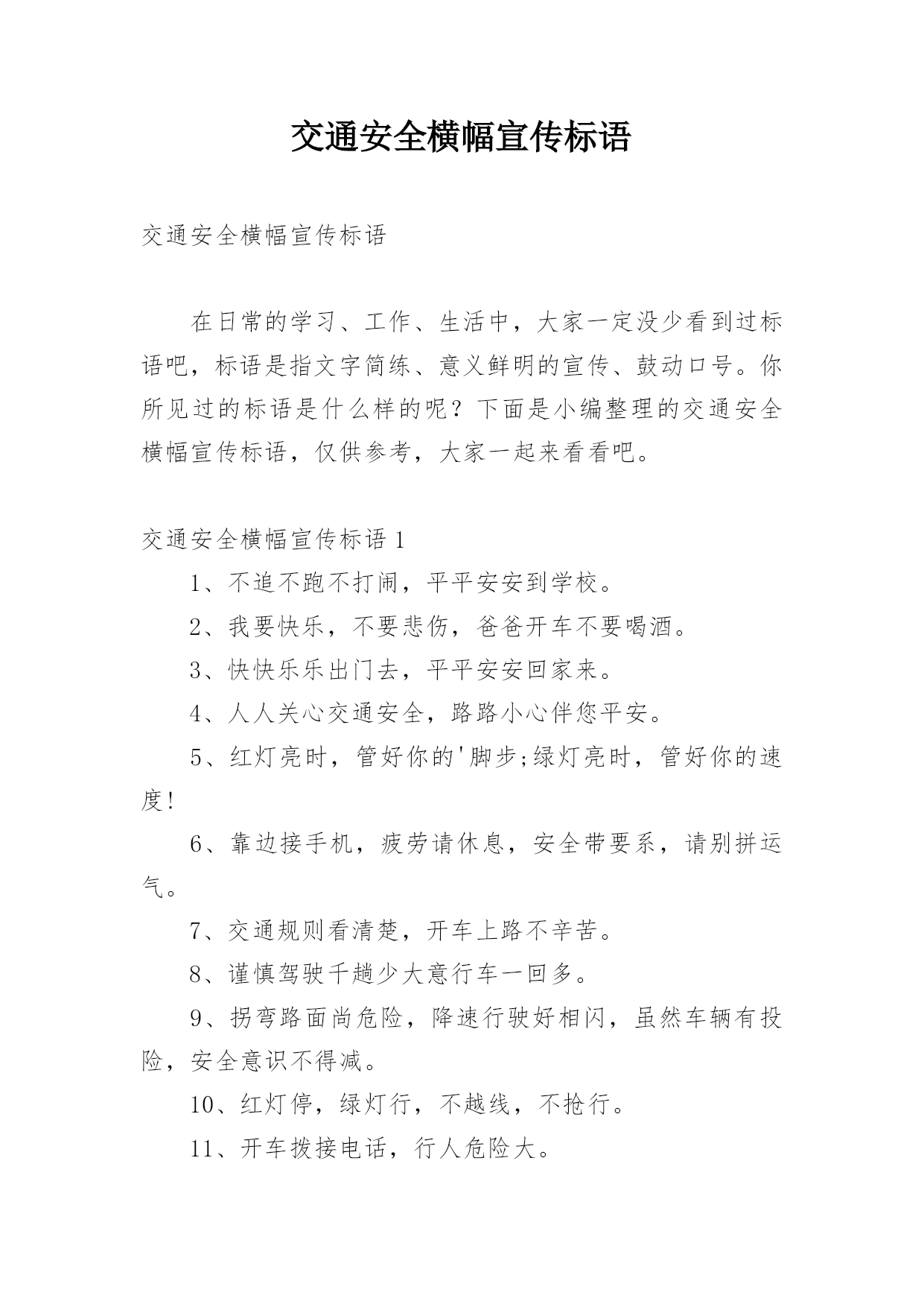 交通安全横幅宣传标语交通安全横幅宣传标语在日常的学习、工作、生活中,大家一定没少看到过标语吧,标语是指文字简练、意义鲜明的宣传、鼓动口号。你所见过的标语是什么样的呢?下面是小编整理的交通安全横幅宣传标语,仅供参考,大家一起来看看吧。交通安全横幅宣传标语11、不追不跑不打闹,平平安安到学校。2、我要快乐,不要悲伤,爸爸开车不要喝酒。3、快快乐乐出门去,平平安安回家来。4、人人关心交通安全,路路小心伴您平安。5、红灯亮时,管好你的'脚步;绿灯亮时,管好你的速度!6、靠边接手机,疲劳请休息,安全带要系,请别拼运