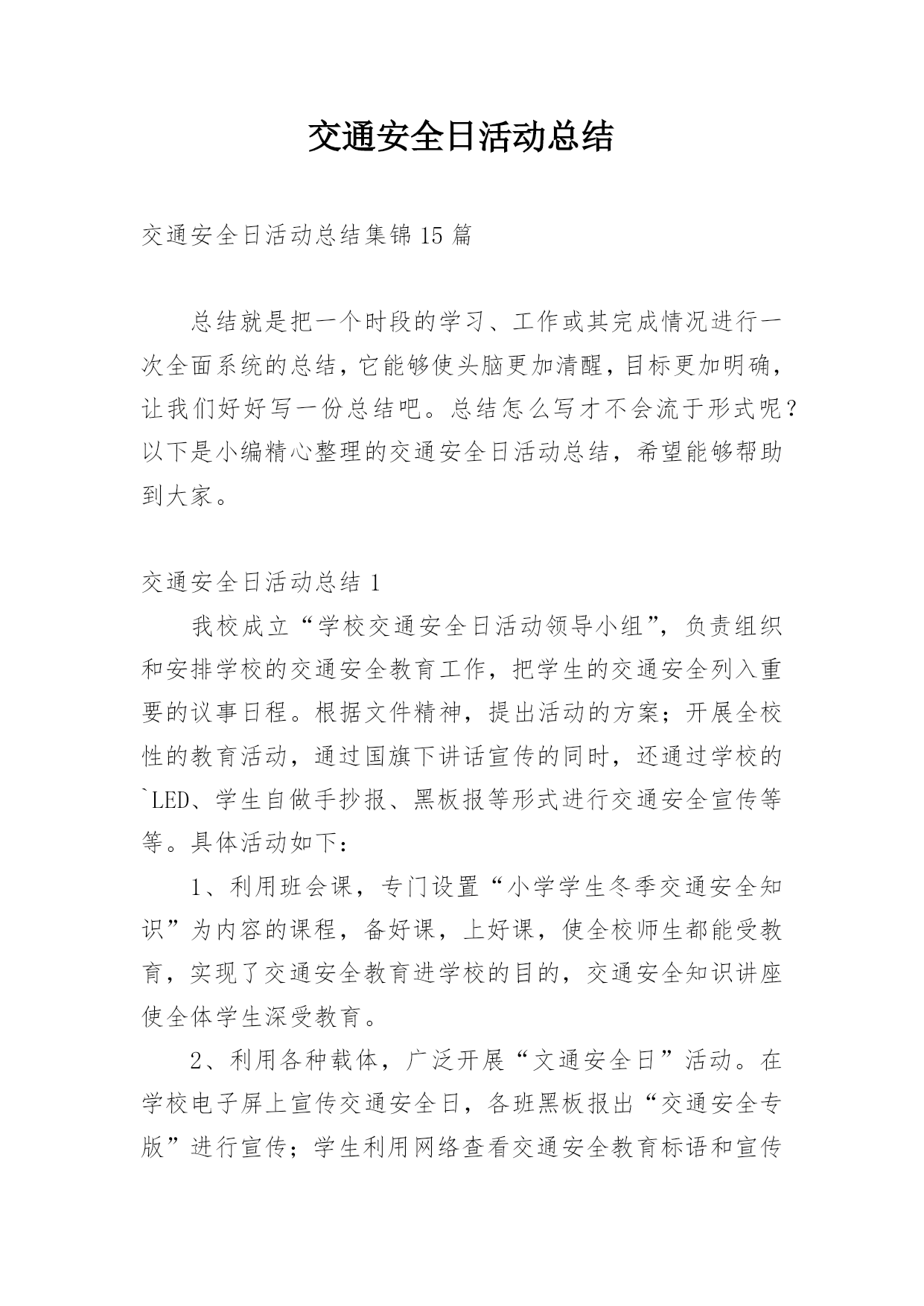 交通安全日活动总结交通安全日活动总结集锦15篇总结就是把一个时段的学习、工作或其完成情况进行一次全面系统的总结,它能够使头脑更加清醒,目标更加明确,让我们好好写一份总结吧。总结怎么写才不会流于形式呢?以下是小编精心整理的交通安全日活动总结,希望能够帮助到大家。交通安全日活动总结1我校成立“学校交通安全日活动领导小组”,负责组织和安排学校的交通安全教育工作,把学生的交通安全列入重要的议事日程。根据文件精神,提出活动的方案;开展全校性的教育活动,通过国旗下讲话宣传的同时,还通过学校的`LED、学生自做手抄报、