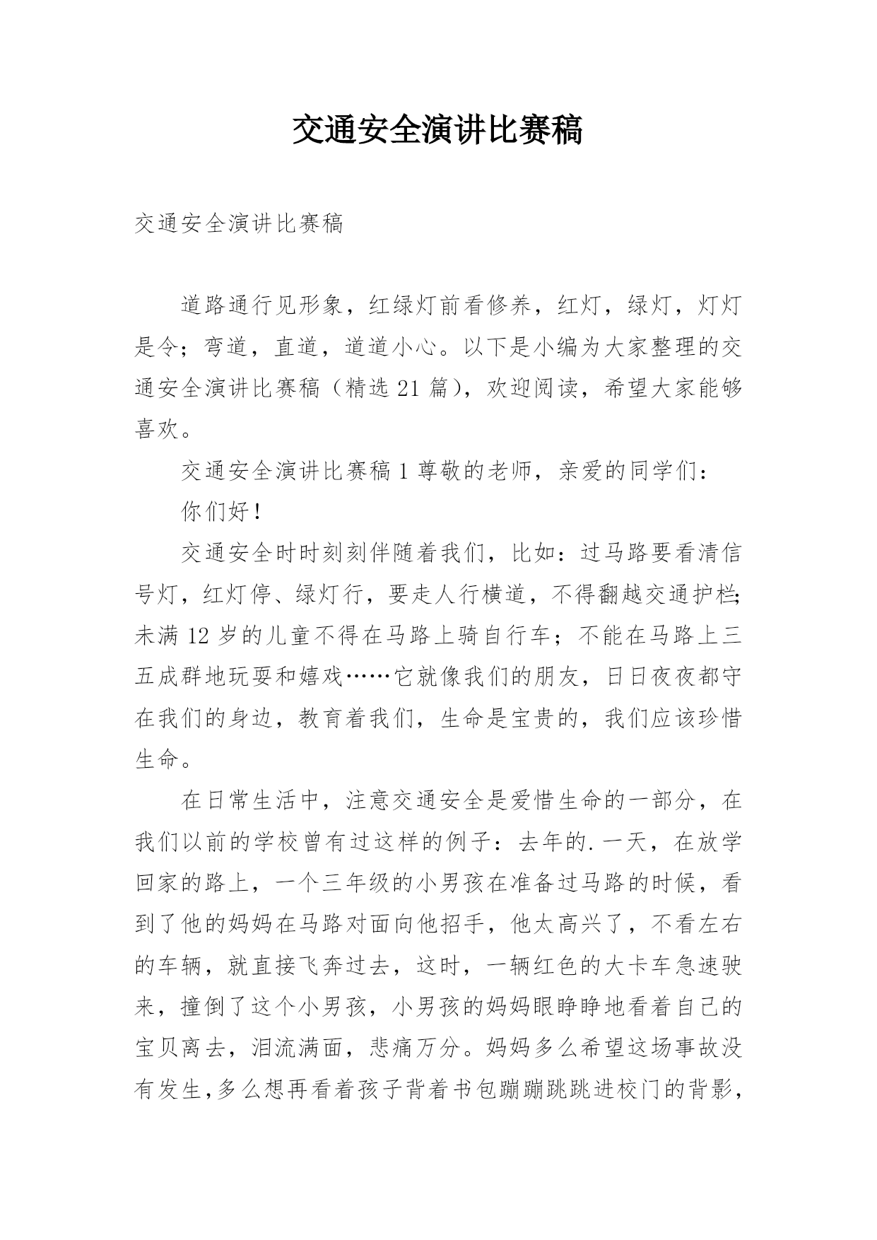 交通安全演讲比赛稿交通安全演讲比赛稿道路通行见形象,红绿灯前看修养,红灯,绿灯,灯灯是令;弯道,直道,道道小心。以下是小编为大家整理的交通安全演讲比赛稿(精选21篇),欢迎阅读,希望大家能够喜欢。交通安全演讲比赛稿1尊敬的老师,亲爱的同学们:你们好!交通安全时时刻刻伴随着我们,比如:过马路要看清信号灯,红灯停、绿灯行,要走人行横道,不得翻越交通护栏;未满12岁的儿童不得在马路上骑自行车;不能在马路上三五成群地玩耍和嬉戏……它就像我们的朋友,日日夜夜都守在我们的身边,教育着我们,生命是宝贵的,我们应该珍惜生