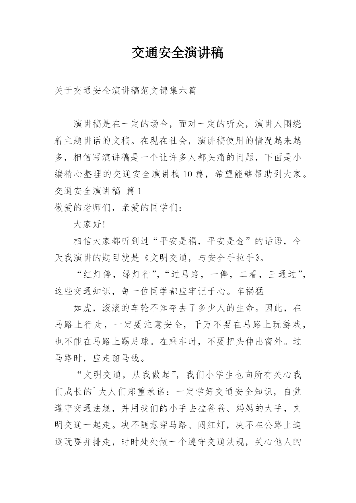 交通安全演讲稿关于交通安全演讲稿范文锦集六篇演讲稿是在一定的场合,面对一定的听众,演讲人围绕着主题讲话的文稿。在现在社会,演讲稿使用的情况越来越多,相信写演讲稿是一个让许多人都头痛的问题,下面是小编精心整理的交通安全演讲稿10篇,希望能够帮助到大家。交通安全演讲稿篇1敬爱的老师们,亲爱的同学们:大家好!相信大家都听到过“平安是福,平安是金”的话语,今天我演讲的题目就是《文明交通,与安全手拉手》。“红灯停,绿灯行”,“过马路,一停,二看,三通过”,这些交通知识,每一位同学都应牢记于心。车祸猛如虎,滚滚的车轮