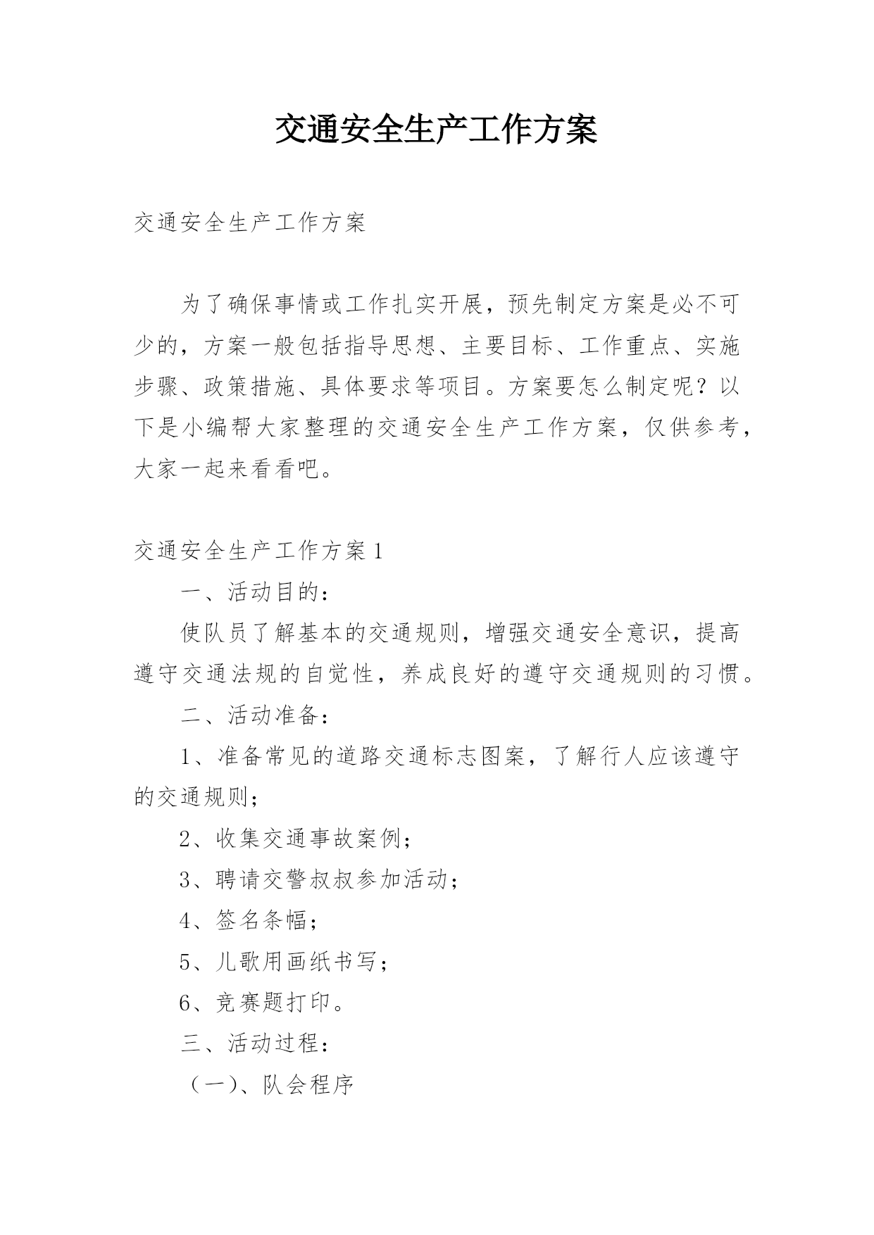 交通安全生产工作方案交通安全生产工作方案为了确保事情或工作扎实开展,预先制定方案是必不可少的,方案一般包括指导思想、主要目标、工作重点、实施步骤、政策措施、具体要求等项目。方案要怎么制定呢?以下是小编帮大家整理的交通安全生产工作方案,仅供参考,大家一起来看看吧。交通安全生产工作方案1一、活动目的:使队员了解基本的交通规则,增强交通安全意识,提高遵守交通法规的自觉性,养成良好的遵守交通规则的习惯。二、活动准备:1、准备常见的道路交通标志图案,了解行人应该遵守的交通规则;2、收集交通事故案例;3、聘请交警叔叔
