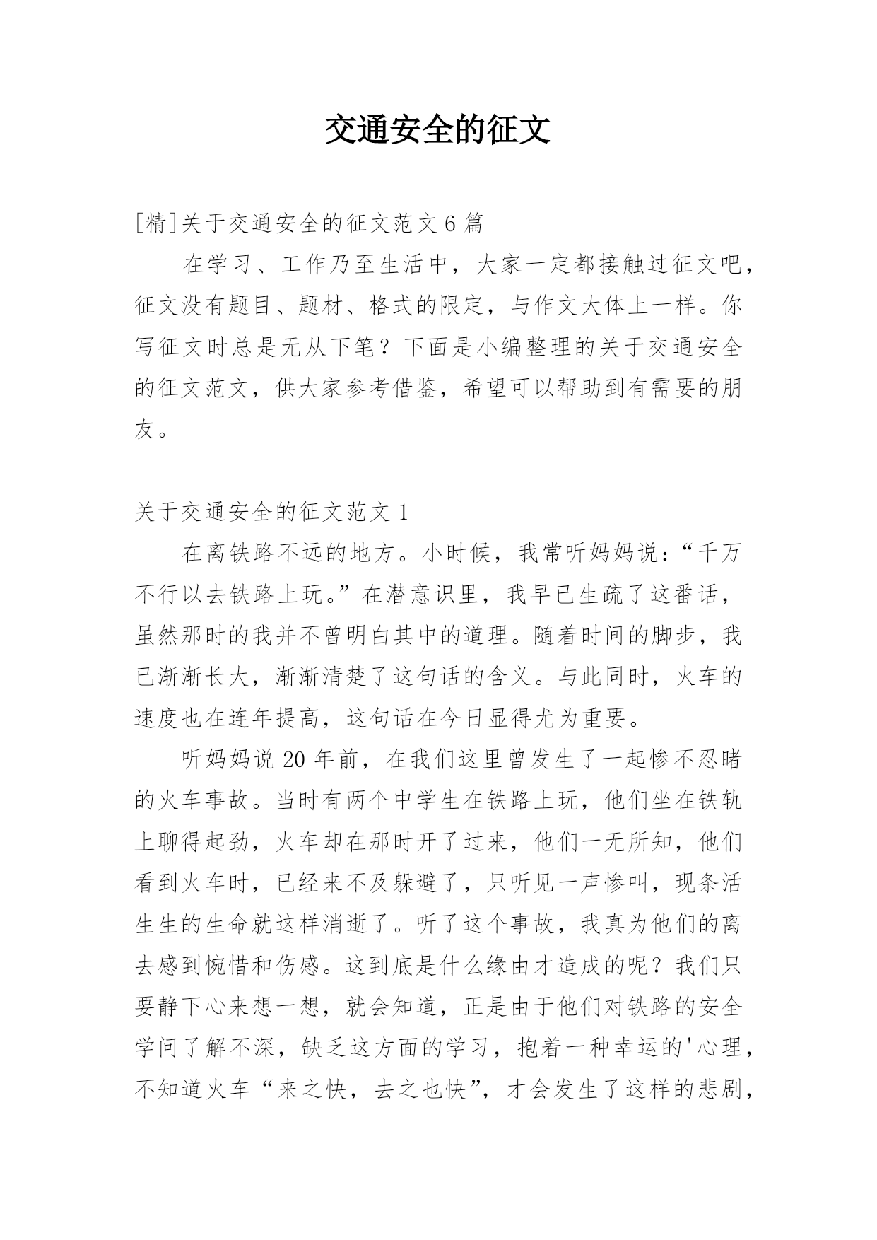 交通安全的征文[精]关于交通安全的征文范文6篇在学习、工作乃至生活中,大家一定都接触过征文吧,征文没有题目、题材、格式的限定,与作文大体上一样。你写征文时总是无从下笔?下面是小编整理的关于交通安全的征文范文,供大家参考借鉴,希望可以帮助到有需要的朋友。关于交通安全的征文范文1在离铁路不远的地方。小时候,我常听妈妈说:“千万不行以去铁路上玩。”在潜意识里,我早已生疏了这番话,虽然那时的我并不曾明白其中的道理。随着时间的脚步,我已渐渐长大,渐渐清楚了这句话的含义。与此同时,火车的速度也在连年提高,这句话在今日