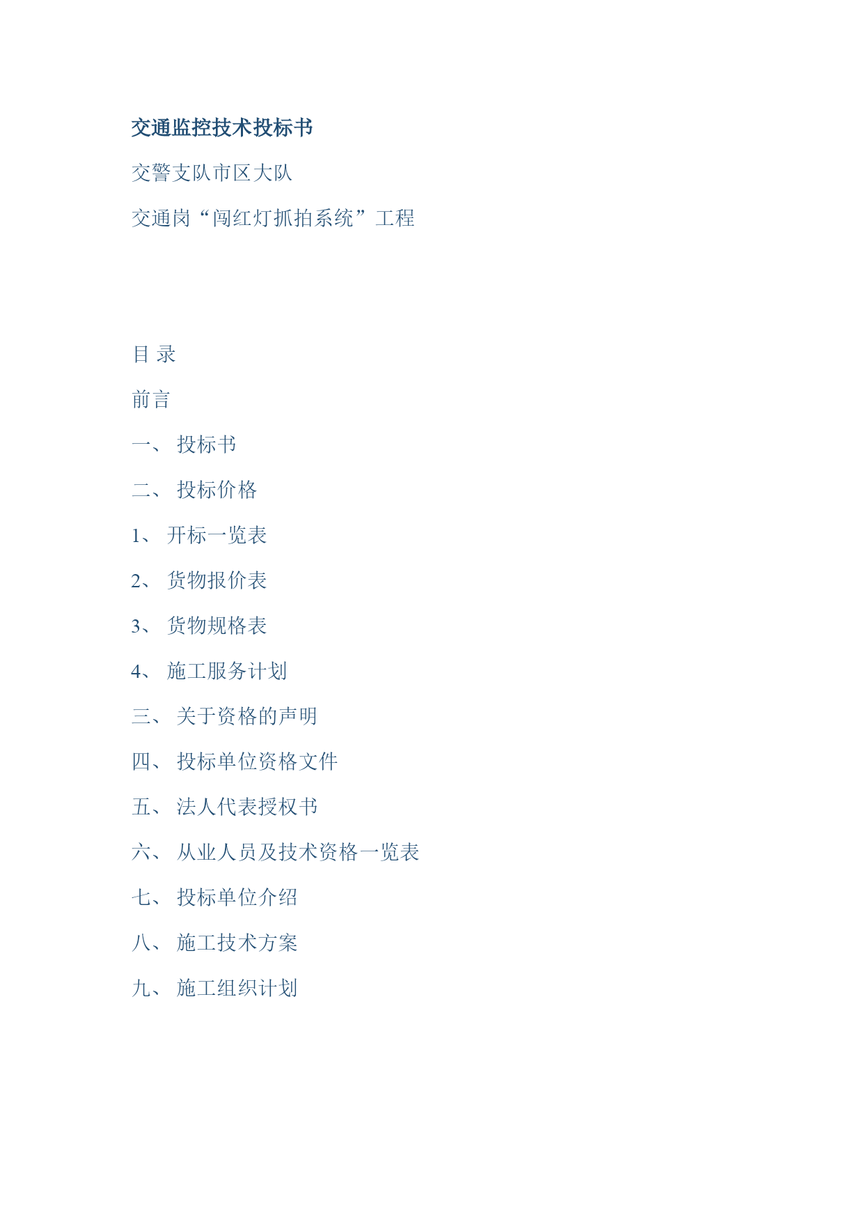 交通监控技术投标书交警支队市区大队交通岗“闯红灯抓拍系统”工程目录前言一、投标书二、投标价格1、开标一览表2、货物报价表3、货物规格表4、施工服务计划三、关于资格的声明四、投标单位资格文件五、法人代表授权书六、从业人员及技术资格一览表七、投标单位介绍八、施工技术方案九、施工组织计划前言随着经济的发展,车辆数量的迅猛增长,各城市交通越来越拥挤,给我们的生活带来许多不便;更由于许多车辆的违章现象,造成了许多经济及人身的伤害,也造成了出现各类事故的隐患,这给创建文明城市、维护交通及人身安全带来许多障碍。由于城市