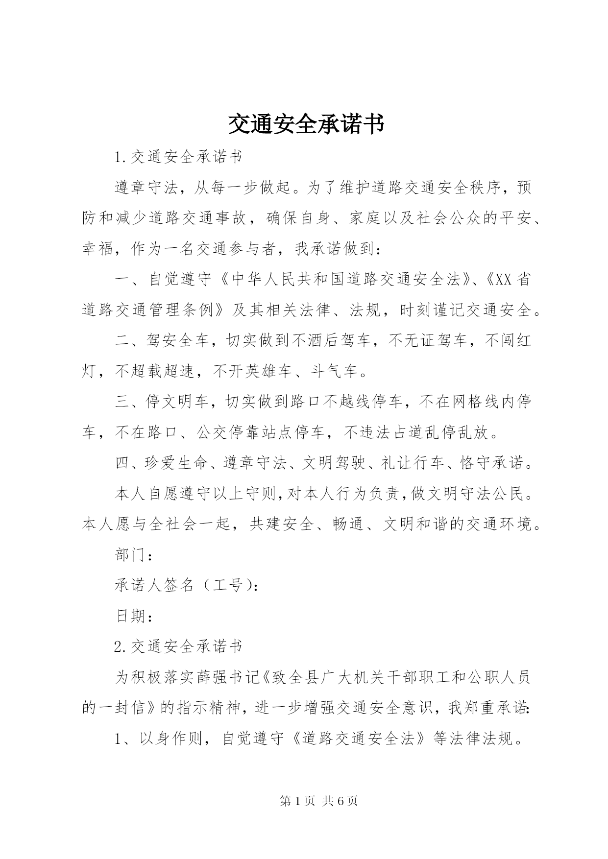 第PAGE\*Arabic\*MERGEFORMAT6页共NUMPAGES\*MERGEFORMAT6页交通安全承诺书1.交通安全承诺书遵章守法,从每一步做起。为了维护道路交通安全秩序,预防和减少道路交通事故,确保自身、家庭以及社会公众的平安、幸福,作为一名交通参与者,我承诺做到:一、自觉遵守《中华人民共和国道路交通安全法》、《XX省道路交通管理条例》及其相关法律、法规,时刻谨记交通安全。二、驾安全车,切实做到不酒后驾车,不无证驾车,不闯红灯,不超载超速,不开英雄车、斗气车。三、停文明车,切实