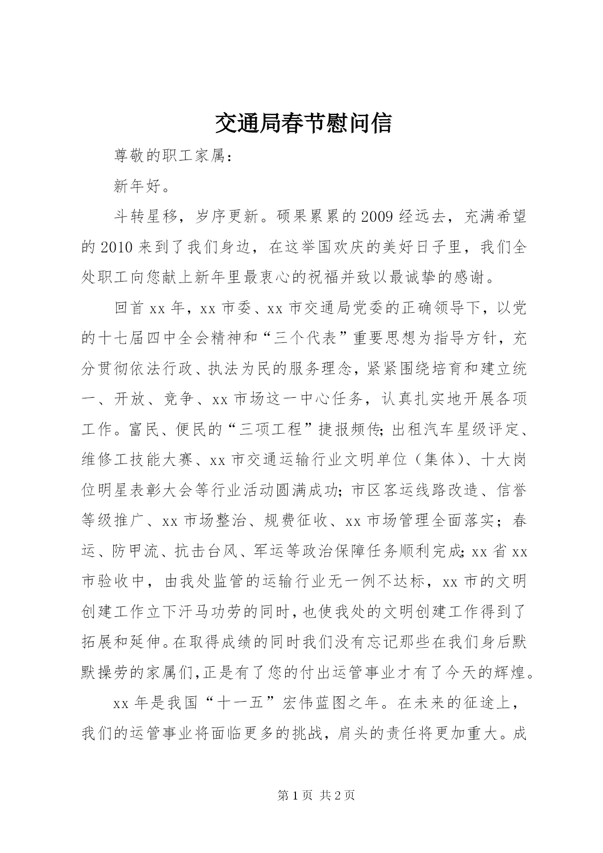 第PAGE\*Arabic\*MERGEFORMAT2页共NUMPAGES\*MERGEFORMAT2页交通局春节慰问信尊敬的职工家属:新年好。斗转星移,岁序更新。硕果累累的2009经远去,充满希望的2010来到了我们身边,在这举国欢庆的美好日子里,我们全处职工向您献上新年里最衷心的祝福并致以最诚挚的感谢。回首xx年,xx市委、xx市交通局党委的正确领导下,以党的十七届四中全会精神和“三个代表”重要思想为指导方针,充分贯彻依法行政、执法为民的服务理念,紧紧围绕培育和建立统一、开放、竞争、xx市