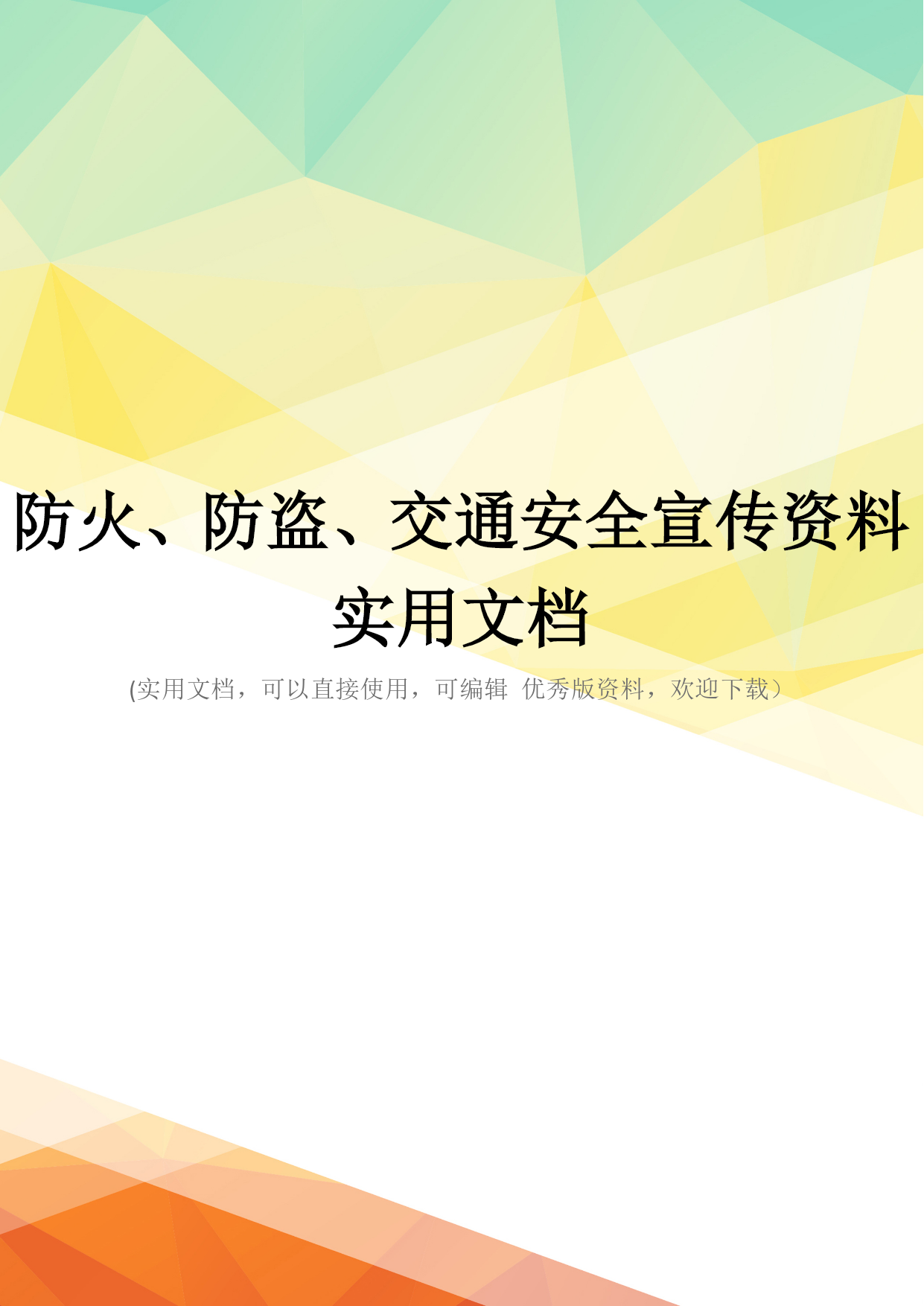 防火、防盗、交通安全宣传资料实用文档(实用文档,可以直接使用,可编辑优秀版资料,欢迎下载)防火、防溺水、交通安全宣传资料1、有小孩的家庭不宜在孩子活动的场所放置落地灯、落地扇之类一碰就倒的电器,如果将此类电器放置在后面或其他孩子不易接触到的地方,则较为安全。2、有茶几的家庭,一定要准备一个烟灰缸。烟灰缸最好是瓷的或搪瓷的,里面放少许水.3、家用电器应当同暖气、煤气设备分隔.因为大多数家用电器都是怕热的,高温环境会使电器线路绝缘层遭到破坏。烤火取暖严禁使用汽油、煤油、酒精等易燃物引火,火炉周围不得堆放可燃物