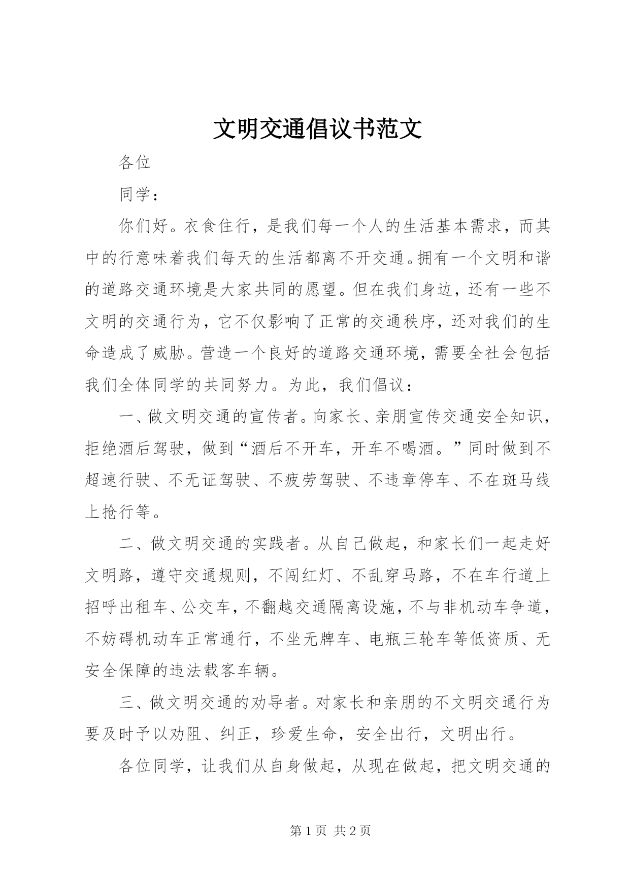 第PAGE\*Arabic\*MERGEFORMAT2页共NUMPAGES\*MERGEFORMAT2页文明交通倡议书范文各位同学:你们好。衣食住行,是我们每一个人的生活基本需求,而其中的行意味着我们每天的生活都离不开交通。拥有一个文明和谐的道路交通环境是大家共同的愿望。但在我们身边,还有一些不文明的交通行为,它不仅影响了正常的交通秩序,还对我们的生命造成了威胁。营造一个良好的道路交通环境,需要全社会包括我们全体同学的共同努力。为此,我们倡议:一、做文明交通的宣传者。向家长、亲朋宣传交通安全知