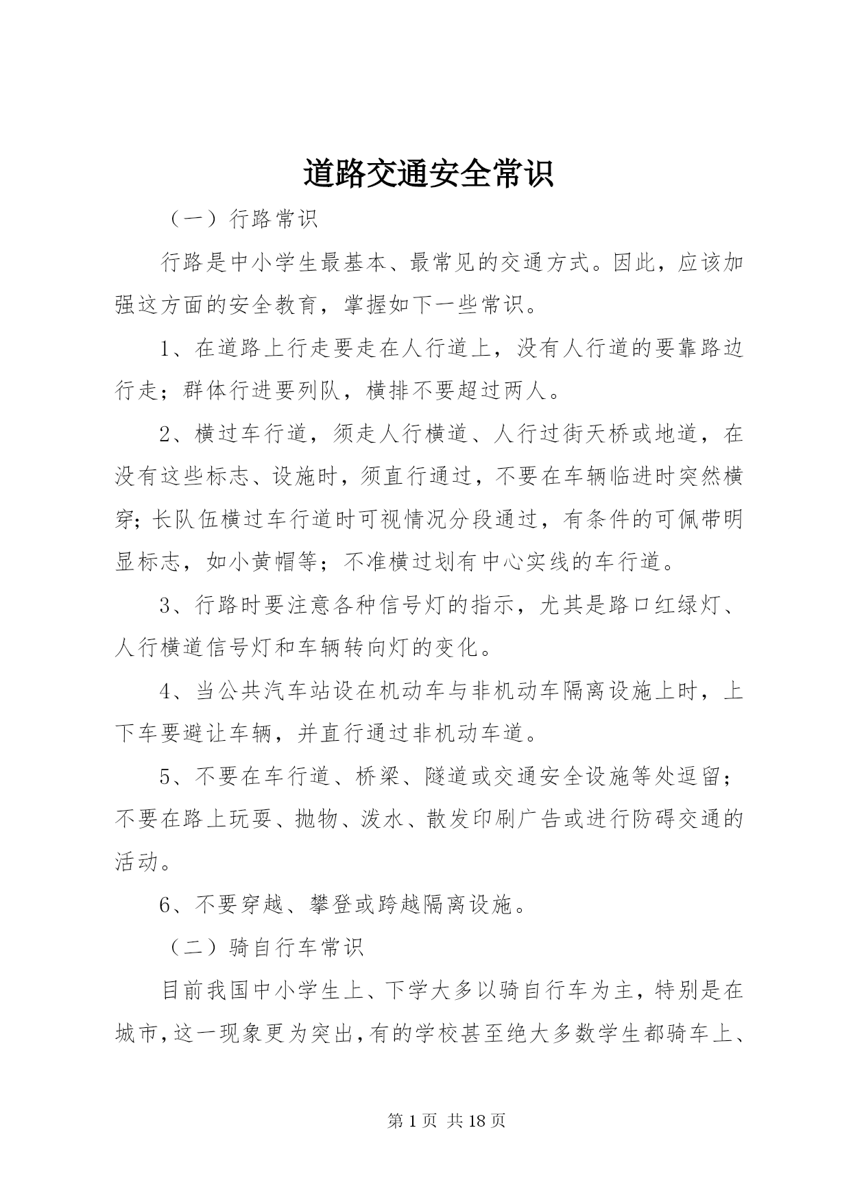 第PAGE\*Arabic\*MERGEFORMAT18页共NUMPAGES\*MERGEFORMAT18页道路交通安全常识(一)行路常识行路是中小学生最基本、最常见的交通方式。因此,应该加强这方面的安全教育,掌握如下一些常识。1、在道路上行走要走在人行道上,没有人行道的要靠路边行走;群体行进要列队,横排不要超过两人。2、横过车行道,须走人行横道、人行过街天桥或地道,在没有这些标志、设施时,须直行通过,不要在车辆临进时突然横穿;长队伍横过车行道时可视情况分段通过,有条件的可佩带明显标志,如小黄