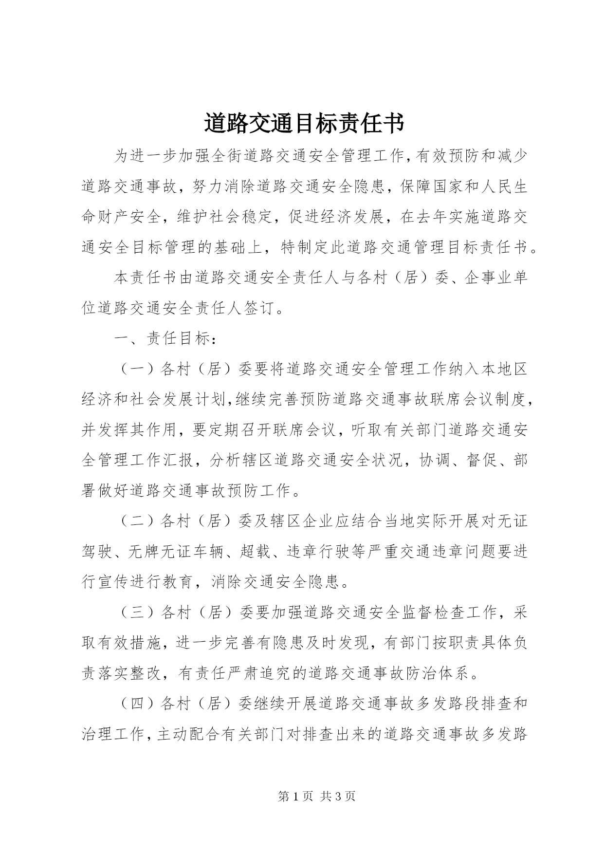第PAGE\*Arabic\*MERGEFORMAT3页共NUMPAGES\*MERGEFORMAT3页道路交通目标责任书为进一步加强全街道路交通安全管理工作,有效预防和减少道路交通事故,努力消除道路交通安全隐患,保障国家和人民生命财产安全,维护社会稳定,促进经济发展,在去年实施道路交通安全目标管理的基础上,特制定此道路交通管理目标责任书。本责任书由道路交通安全责任人与各村(居)委、企事业单位道路交通安全责任人签订。一、责任目标:(一)各村(居)委要将道路交通安全管理工作纳入本地区经济和社会发