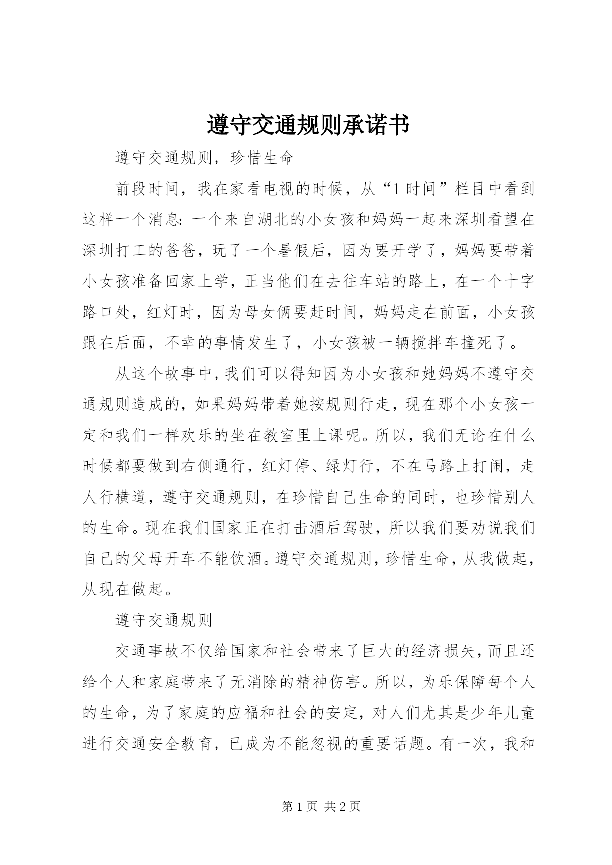 第PAGE\*Arabic\*MERGEFORMAT2页共NUMPAGES\*MERGEFORMAT2页遵守交通规则承诺书遵守交通规则,珍惜生命前段时间,我在家看电视的时候,从“1时间”栏目中看到这样一个消息:一个来自湖北的小女孩和妈妈一起来深圳看望在深圳打工的爸爸,玩了一个暑假后,因为要开学了,妈妈要带着小女孩准备回家上学,正当他们在去往车站的路上,在一个十字路口处,红灯时,因为母女俩要赶时间,妈妈走在前面,小女孩跟在后面,不幸的事情发生了,小女孩被一辆搅拌车撞死了。从这个故事中,我们可以得