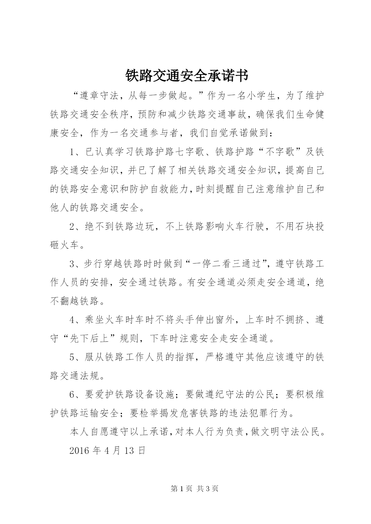 第PAGE\*Arabic\*MERGEFORMAT3页共NUMPAGES\*MERGEFORMAT3页铁路交通安全承诺书“遵章守法,从每一步做起。”作为一名小学生,为了维护铁路交通安全秩序,预防和减少铁路交通事故,确保我们生命健康安全,作为一名交通参与者,我们自觉承诺做到:1、已认真学习铁路护路七字歌、铁路护路“不字歌”及铁路交通安全知识,并已了解了相关铁路交通安全知识,提高自己的铁路安全意识和防护自救能力,时刻提醒自己注意维护自己和他人的铁路交通安全。2、绝不到铁路边玩,不上铁路影响火车行