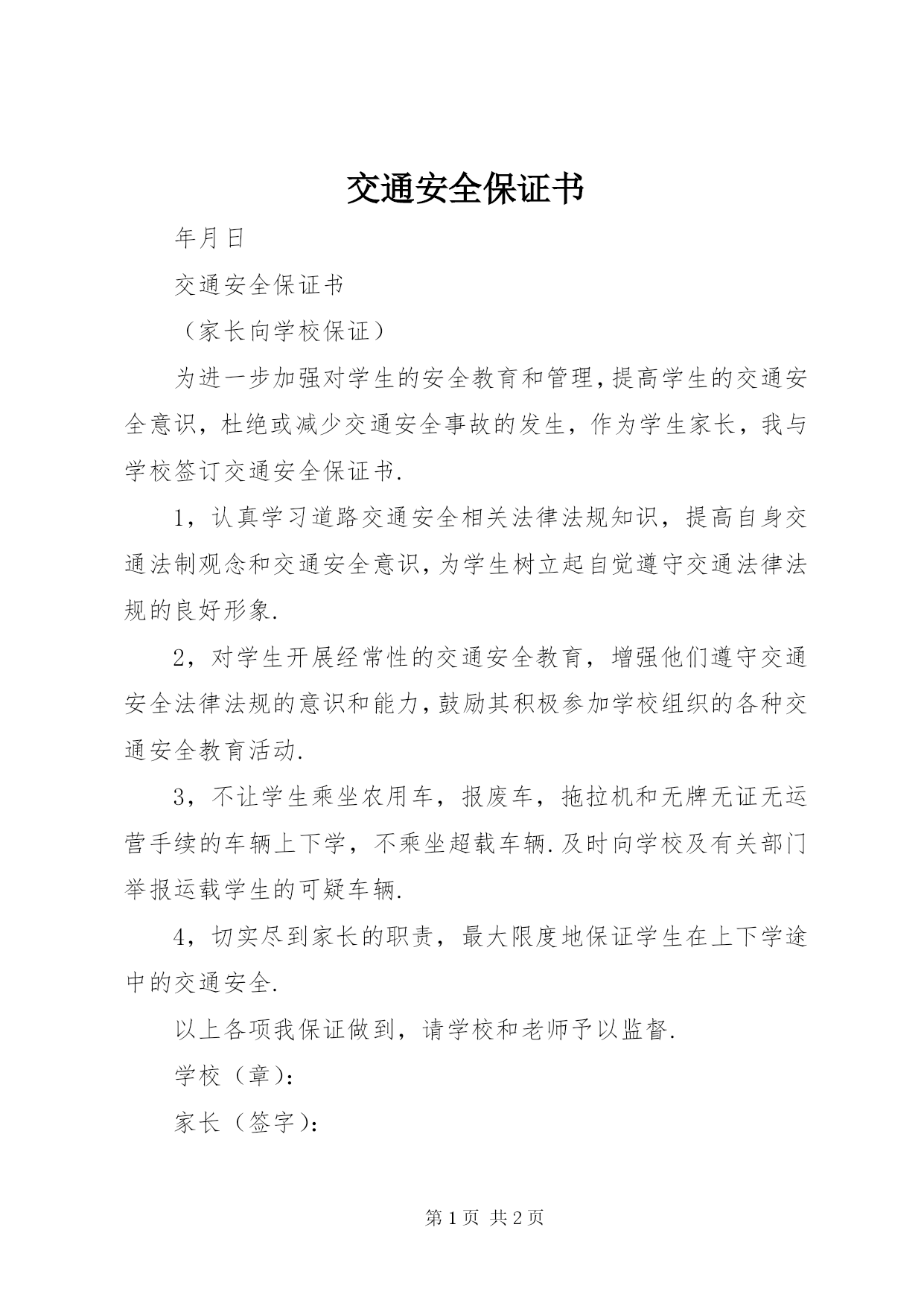 第PAGE\*Arabic\*MERGEFORMAT2页共NUMPAGES\*MERGEFORMAT2页交通安全保证书年月日交通安全保证书(家长向学校保证)为进一步加强对学生的安全教育和管理,提高学生的交通安全意识,杜绝或减少交通安全事故的发生,作为学生家长,我与学校签订交通安全保证书.1,认真学习道路交通安全相关法律法规知识,提高自身交通法制观念和交通安全意识,为学生树立起自觉遵守交通法律法规的良好形象.2,对学生开展经常性的交通安全教育,增强他们遵守交通安全法律法规的意识和能力,鼓励其积极