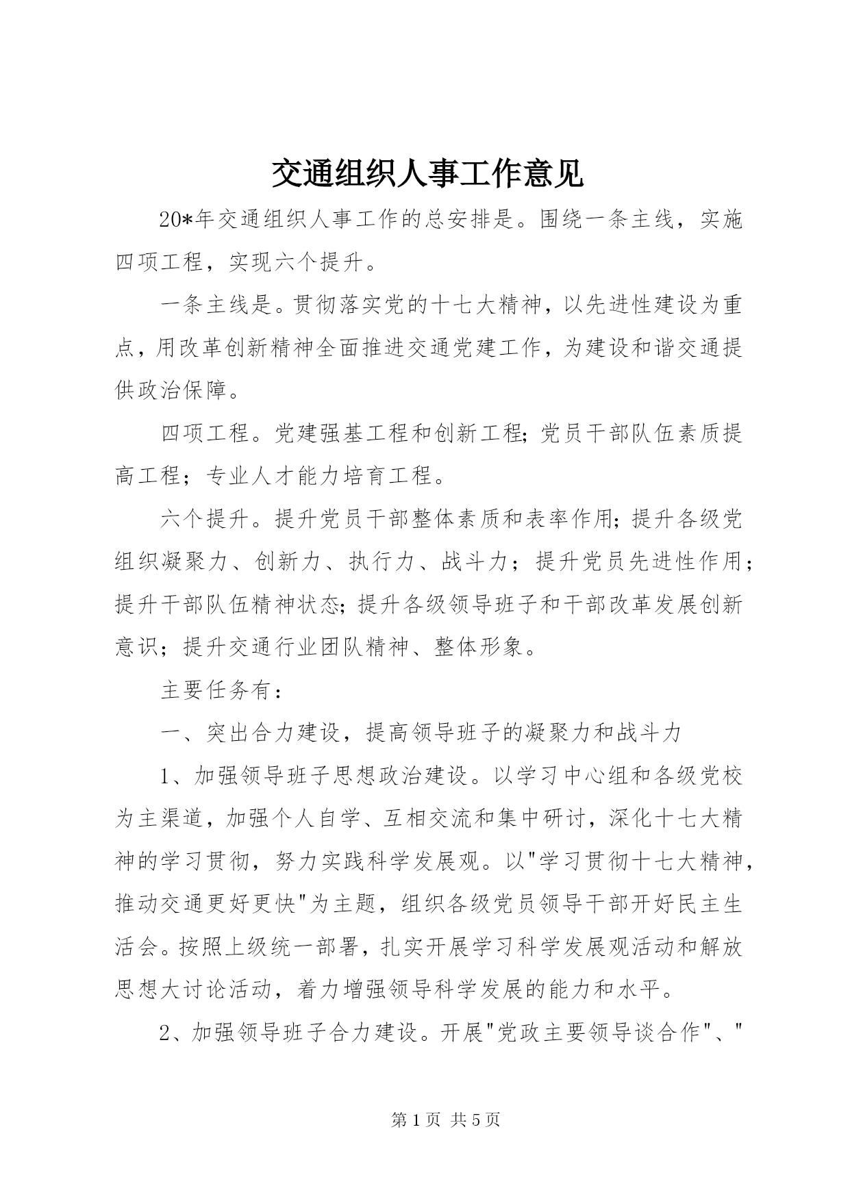 第PAGE\*Arabic\*MERGEFORMAT5页共NUMPAGES\*MERGEFORMAT5页交通组织人事工作意见20*年交通组织人事工作的总安排是。围绕一条主线,实施四项工程,实现六个提升。一条主线是。贯彻落实党的十七大精神,以先进性建设为重点,用改革创新精神全面推进交通党建工作,为建设和谐交通提供政治保障。四项工程。党建强基工程和创新工程;党员干部队伍素质提高工程;专业人才能力培育工程。六个提升。提升党员干部整体素质和表率作用;提升各级党组织凝聚力、创新力、执行力、战斗力;提升党