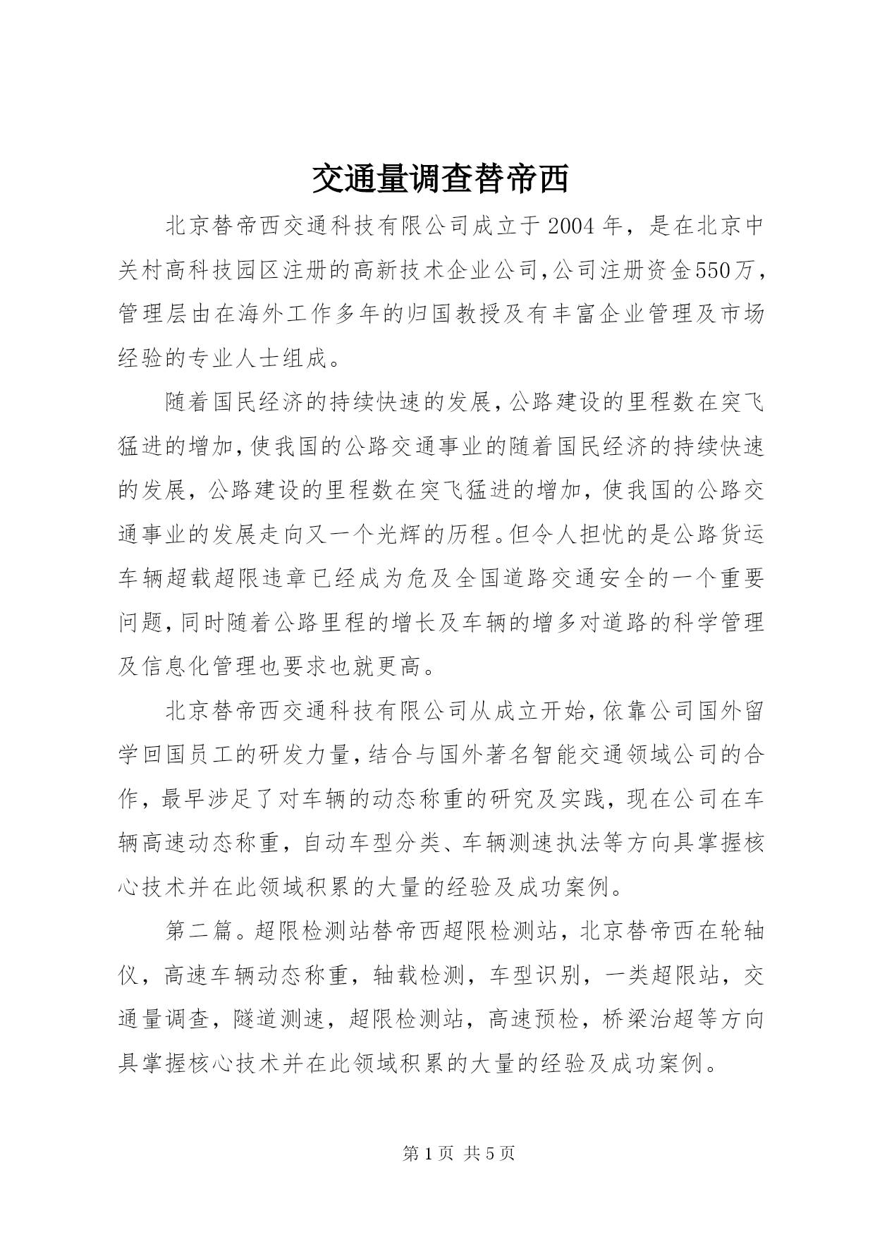 第PAGE\*Arabic\*MERGEFORMAT5页共NUMPAGES\*MERGEFORMAT5页交通量调查替帝西北京替帝西交通科技有限公司成立于2004年,是在北京中关村高科技园区注册的高新技术企业公司,公司注册资金550万,管理层由在海外工作多年的归国教授及有丰富企业管理及市场经验的专业人士组成。随着国民经济的持续快速的发展,公路建设的里程数在突飞猛进的增加,使我国的公路交通事业的随着国民经济的持续快速的发展,公路建设的里程数在突飞猛进的增加,使我国的公路交通事业的发展走向又一个光辉