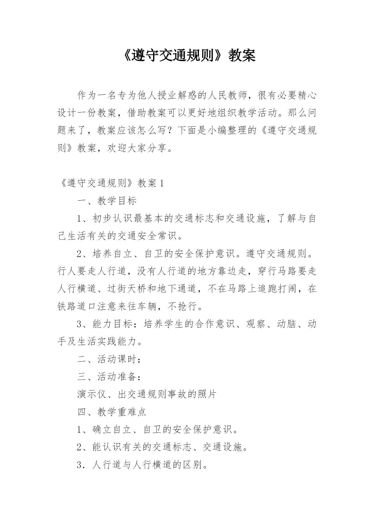 《遵守交通规则》教案作为一名专为他人授业解惑的人民教师,很有必要精心设计一份教案,借助教案可以更好地组织教学活动。那么问题来了,教案应该怎么写?下面是小编整理的《遵守交通规则》教案,欢迎大家分享。《遵守交通规则》教案1一、教学目标1、初步认识最基本的交通标志和交通设施,了解与自己生活有关的交通安全常识。2、培养自立、自卫的安全保护意识。遵守交通规则。行人要走人行道,没有人行道的地方靠边走,穿行马路要走人行横道、过街天桥和地下通道,不在马路上追跑打闹,在铁路道口注意来往车辆,不抢行。3、能力目标:培养学生的