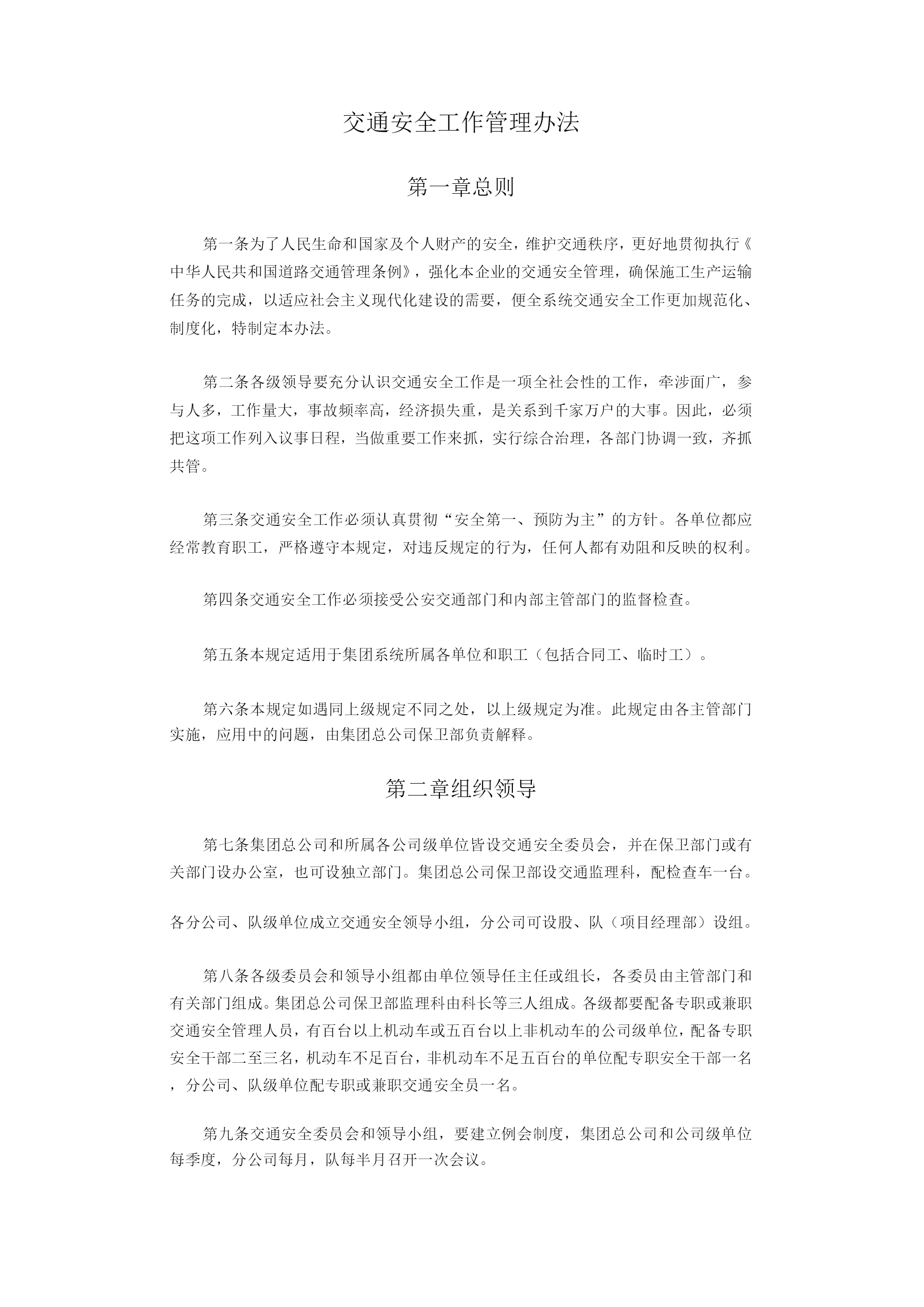 交通安全工作管理办法第一章总则第一条为了人民生命和国家及个人财产的安全,维护交通秩序,更好地贯彻执行《中华人民共和国道路交通管理条例》,强化本企业的交通安全管理,确保施工生产运输任务的完成,以适应社会主义现代化建设的需要,便全系统交通安全工作更加规范化、制度化,特制定本办法。第二条各级领导要充分认识交通安全工作是一项全社会性的工作,牵涉面广,参与人多,工作量大,事故频率高,经济损失重,是关系到千家万户的大事。因此,必须把这项工作列入议事日程,当做重要工作来抓,实行综合治理,各部门协调一致,齐抓共管。第三条