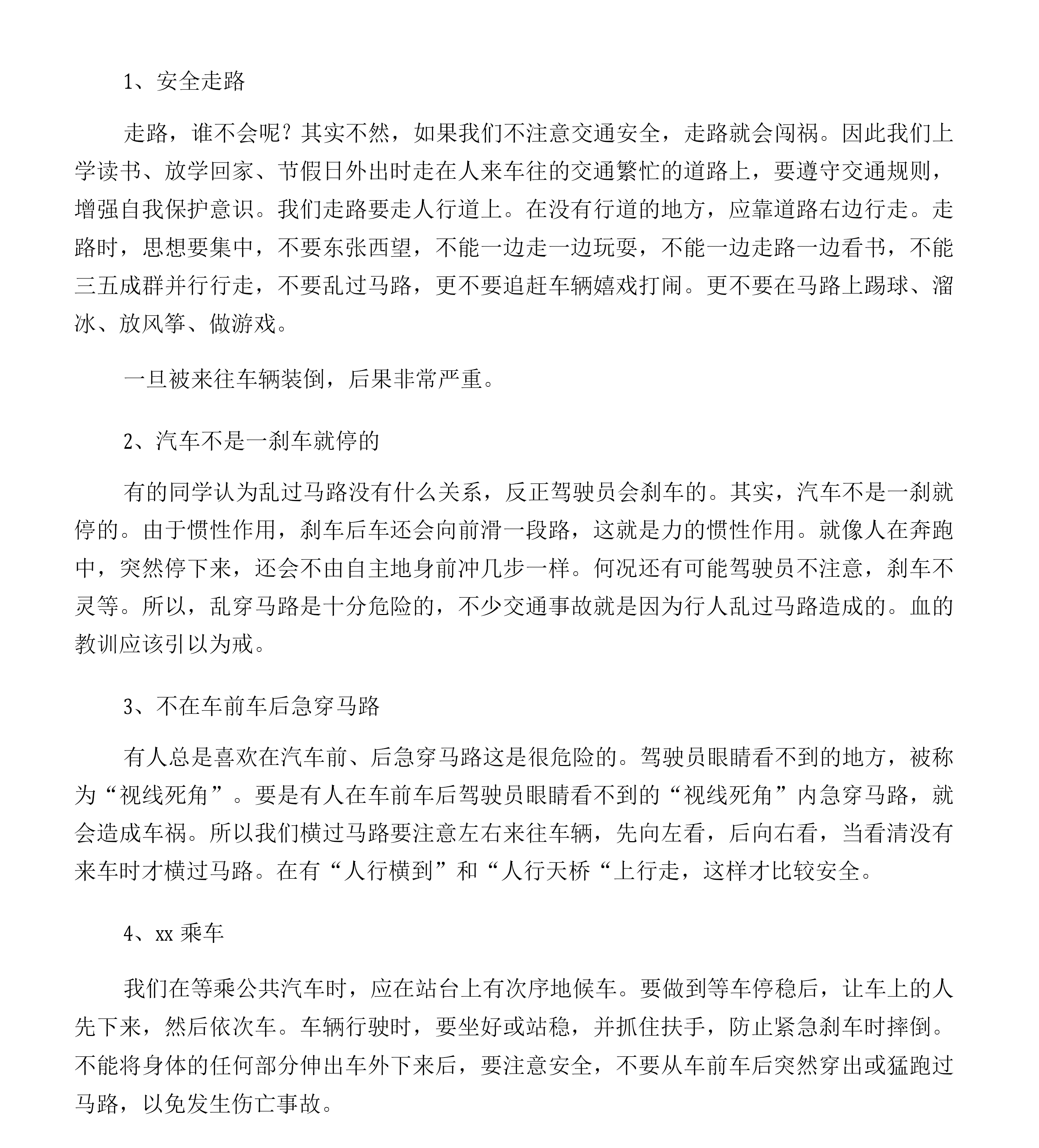1、安全走路走路,谁不会呢?其实不然,如果我们不注意交通安全,走路就会闯祸。因此我们上学读书、放学回家、节假日外出时走在人来车往的交通繁忙的道路上,要遵守交通规则,增强自我保护意识。我们走路要走人行道上。在没有行道的地方,应靠道路右边行走。走路时,思想要集中,不要东张西望,不能一边走一边玩耍,不能一边走路一边看书,不能三五成群并行行走,不要乱过马路,更不要追赶车辆嬉戏打闹。更不要在马路上踢球、溜冰、放风筝、做游戏。一旦被来往车辆装倒,后果非常严重。2、汽车不是一刹车就停的有的同学认为乱过马路没有什么关系,
