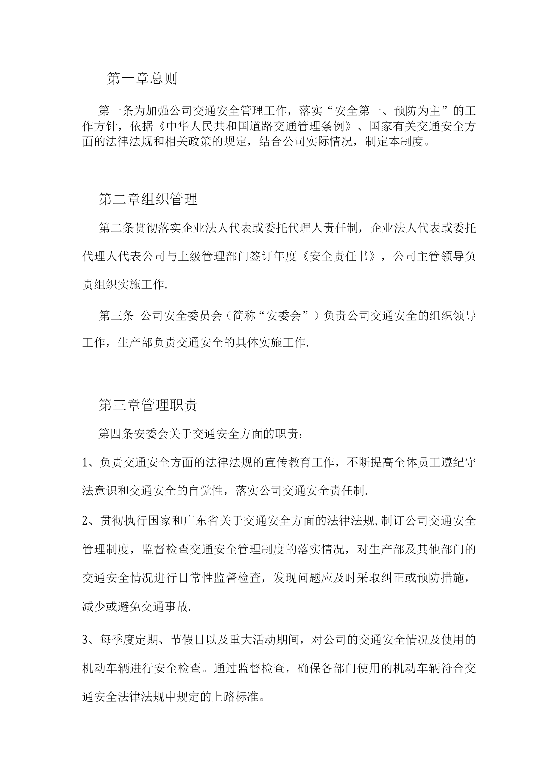 第一章总则第一条为加强公司交通安全管理工作,落实“安全第一、预防为主”的工作方针,依据《中华人民共和国道路交通管理条例》、国家有关交通安全方面的法律法规和相关政策的规定,结合公司实际情况,制定本制度。第二章组织管理第二条贯彻落实企业法人代表或委托代理人责任制,企业法人代表或委托代理人代表公司与上级管理部门签订年度《安全责任书》,公司主管领导负责组织实施工作.第三条公司安全委员会(简称“安委会”)负责公司交通安全的组织领导工作,生产部负责交通安全的具体实施工作.第三章管理职责第四条安委会关于交通安全方面的职