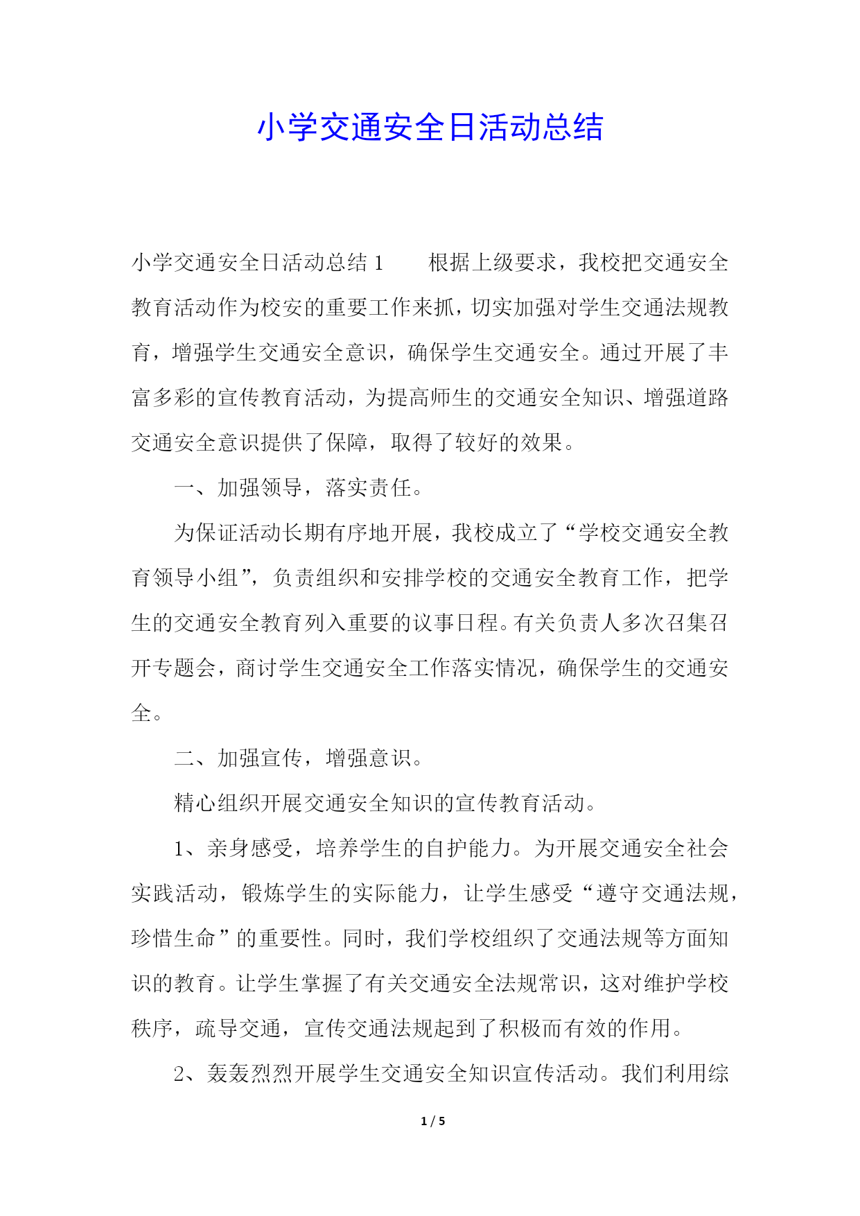 PAGE5/NUMPAGES5小学交通安全日活动总结小学交通安全日活动总结1根据上级要求,我校把交通安全教育活动作为校安的重要工作来抓,切实加强对学生交通法规教育,增强学生交通安全意识,确保学生交通安全。通过开展了丰富多彩的宣传教育活动,为提高师生的交通安全知识、增强道路交通安全意识提供了保障,取得了较好的效果。一、加强领导,落实责任。为保证活动长期有序地开展,我校成立了“学校交通安全教育领导小组”,负责组织和安排学校的交通安全教育工作,把学生的交通安全教育列入重要的议事日程。有关负责人多次召