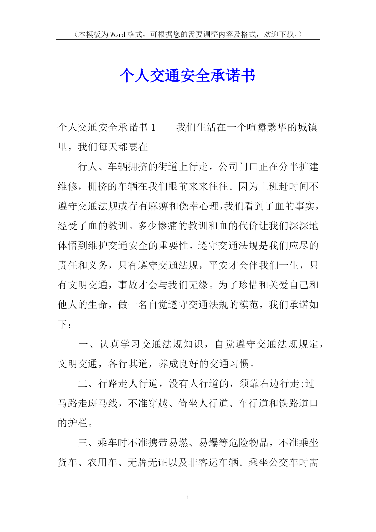 (本模板为Word格式,可根据您的需要调整内容及格式,欢迎下载。)PAGE\*MERGEFORMAT4个人交通安全承诺书个人交通安全承诺书1我们生活在一个喧嚣繁华的城镇里,我们每天都要在行人、车辆拥挤的街道上行走,公司门口正在分半扩建维修,拥挤的车辆在我们眼前来来往往。因为上班赶时间不遵守交通法规或存有麻痹和侥幸心理,我们看到了血的事实,经受了血的教训。多少惨痛的教训和血的代价让我们深深地体悟到维护交通安全的重要性,遵守交通法规是我们应尽的责任和义务,只有遵守交通法规,平安才会伴我们一生,只有文明交