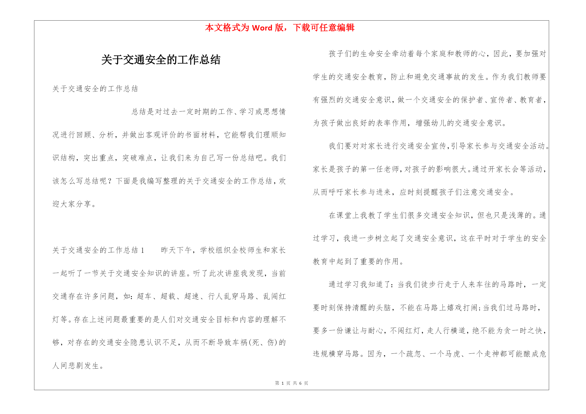 本文格式为Word版,下载可任意编辑第PAGE\*MERGEFORMAT6页共NUMPAGES\*MERGEFORMAT6页关于交通安全的工作总结关于交通安全的工作总结总结是对过去一定时期的工作、学习或思想情况进行回顾、分析,并做出客观评价的书面材料,它能帮我们理顺知识结构,突出重点,突破难点,让我们来为自己写一份总结吧。我们该怎么写总结呢?下面是我编写整理的关于交通安全的工作总结,欢迎大家分享。关于交通安全的工作总结1昨天下午,学校组织全校师生和家长一起听了一节关于交通安全知识的讲座。听了此