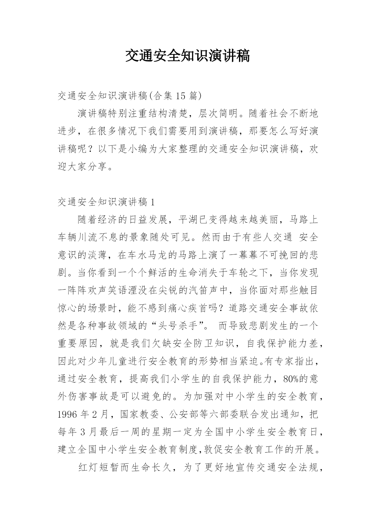 交通安全知识演讲稿交通安全知识演讲稿(合集15篇)演讲稿特别注重结构清楚,层次简明。随着社会不断地进步,在很多情况下我们需要用到演讲稿,那要怎么写好演讲稿呢?以下是小编为大家整理的交通安全知识演讲稿,欢迎大家分享。交通安全知识演讲稿1随着经济的日益发展,平湖已变得越来越美丽,马路上车辆川流不息的景象随处可见。然而由于有些人交通安全意识的淡薄,在车水马龙的马路上演了一幕幕不可挽回的悲剧。当你看到一个个鲜活的生命消失于车轮之下,当你发现一阵阵欢声笑语湮没在尖锐的汽笛声中,当你面对那些触目惊心的场景时,能不感到