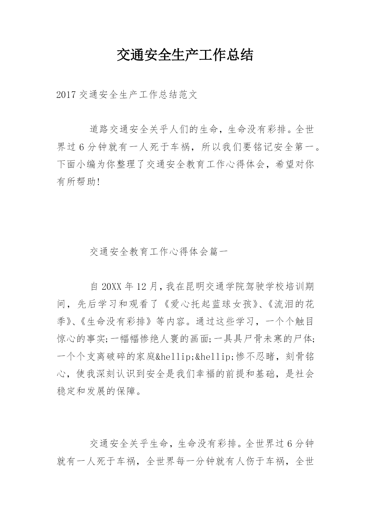 交通安全生产工作总结2017交通安全生产工作总结范文道路交通安全关乎人们的生命,生命没有彩排。全世界过6分钟就有一人死于车祸,所以我们要铭记安全第一。下面小编为你整理了交通安全教育工作心得体会,希望对你有所帮助!交通安全教育工作心得体会篇一自20XX年12月,我在昆明交通学院驾驶学校培训期间,先后学习和观看了《爱心托起蓝球女孩》、《流泪的花季》、《生命没有彩排》等内容。通过这些学习,一个个触目惊心的事实;一幅幅惨绝人寰的画面;一具具尸骨未寒的尸体;一个个支离破碎的家庭……惨不忍