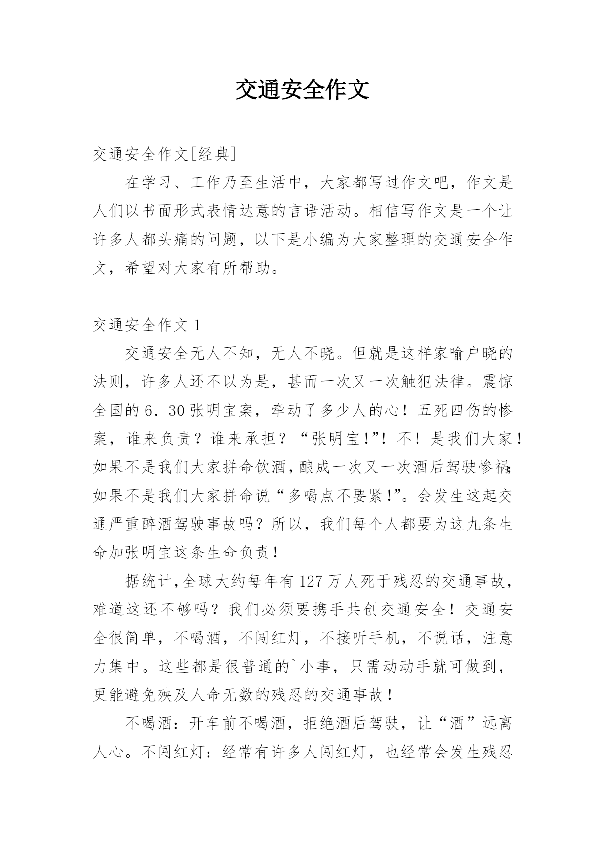 交通安全作文交通安全作文[经典]在学习、工作乃至生活中,大家都写过作文吧,作文是人们以书面形式表情达意的言语活动。相信写作文是一个让许多人都头痛的问题,以下是小编为大家整理的交通安全作文,希望对大家有所帮助。交通安全作文1交通安全无人不知,无人不晓。但就是这样家喻户晓的法则,许多人还不以为是,甚而一次又一次触犯法律。震惊全国的6.30张明宝案,牵动了多少人的心!五死四伤的惨案,谁来负责?谁来承担?“张明宝!”!不!是我们大家!如果不是我们大家拼命饮酒,酿成一次又一次酒后驾驶惨祸;如果不是我们大家拼命说“多