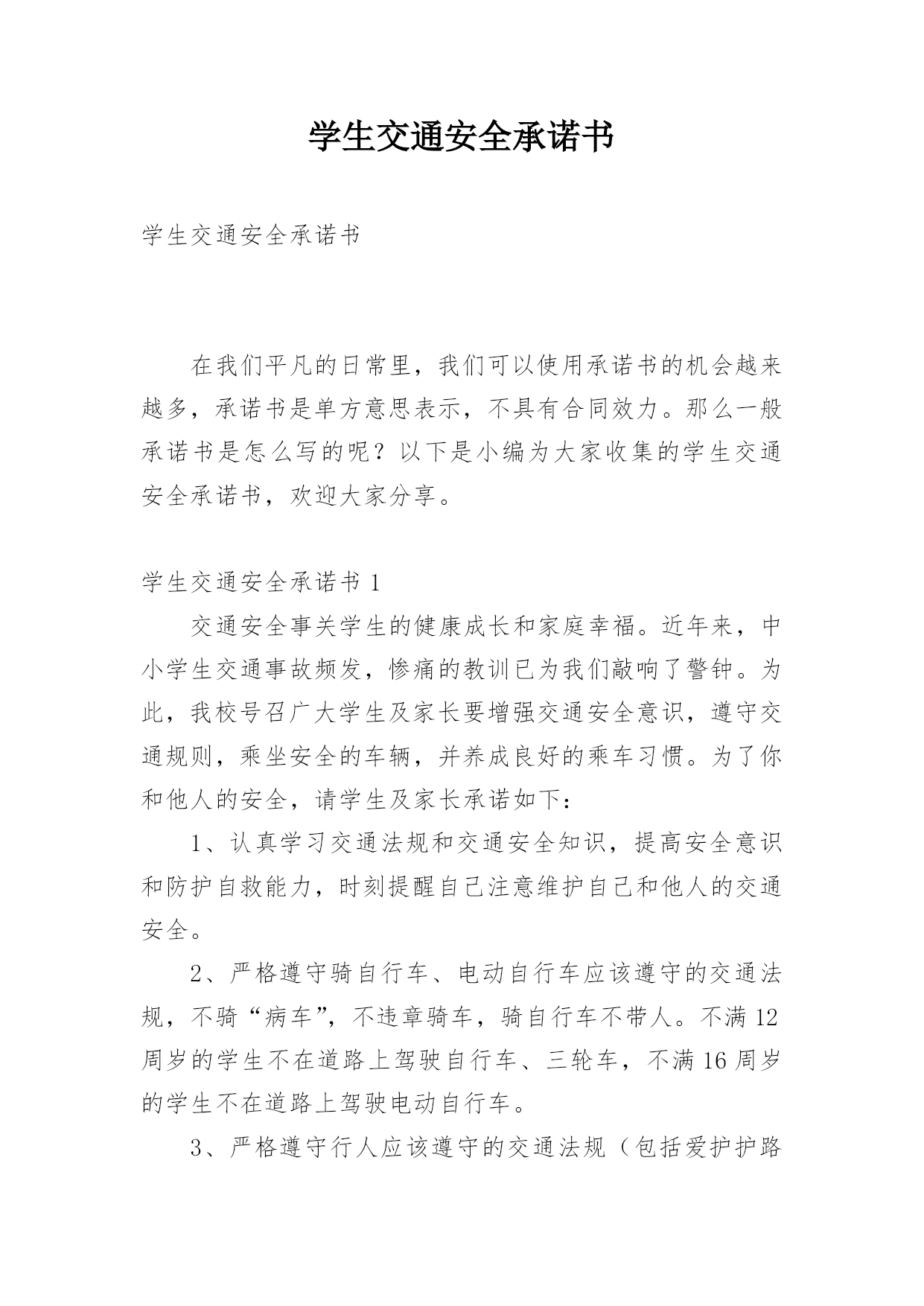 学生交通安全承诺书学生交通安全承诺书在我们平凡的日常里,我们可以使用承诺书的机会越来越多,承诺书是单方意思表示,不具有合同效力。那么一般承诺书是怎么写的呢?以下是小编为大家收集的学生交通安全承诺书,欢迎大家分享。学生交通安全承诺书1交通安全事关学生的健康成长和家庭幸福。近年来,中小学生交通事故频发,惨痛的教训已为我们敲响了警钟。为此,我校号召广大学生及家长要增强交通安全意识,遵守交通规则,乘坐安全的车辆,并养成良好的乘车习惯。为了你和他人的安全,请学生及家长承诺如下:1、认真学习交通法规和交通安全知识,提