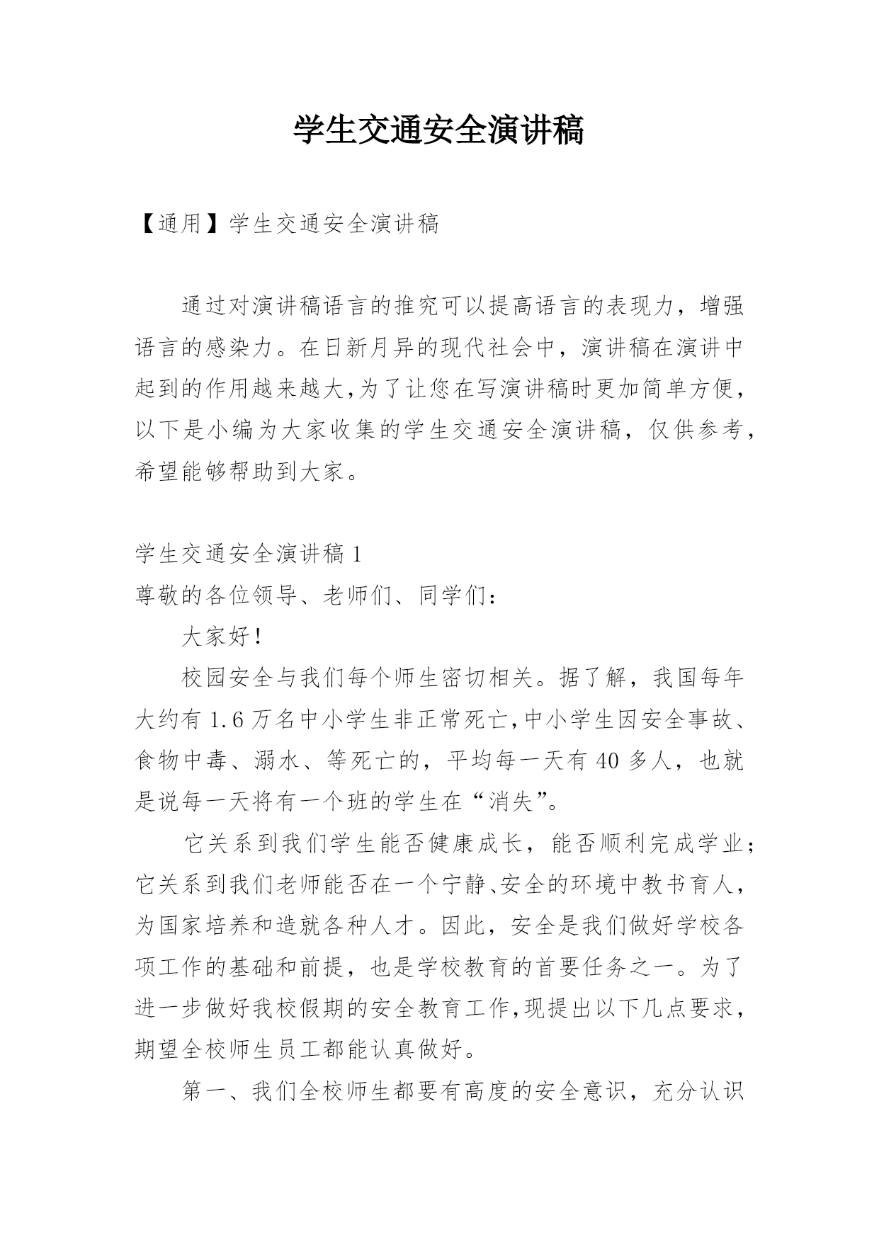 学生交通安全演讲稿【通用】学生交通安全演讲稿通过对演讲稿语言的推究可以提高语言的表现力,增强语言的感染力。在日新月异的现代社会中,演讲稿在演讲中起到的作用越来越大,为了让您在写演讲稿时更加简单方便,以下是小编为大家收集的学生交通安全演讲稿,仅供参考,希望能够帮助到大家。学生交通安全演讲稿1尊敬的各位领导、老师们、同学们:大家好!校园安全与我们每个师生密切相关。据了解,我国每年大约有1.6万名中小学生非正常死亡,中小学生因安全事故、食物中毒、溺水、等死亡的,平均每一天有40多人,也就是说每一天将有一个班的学
