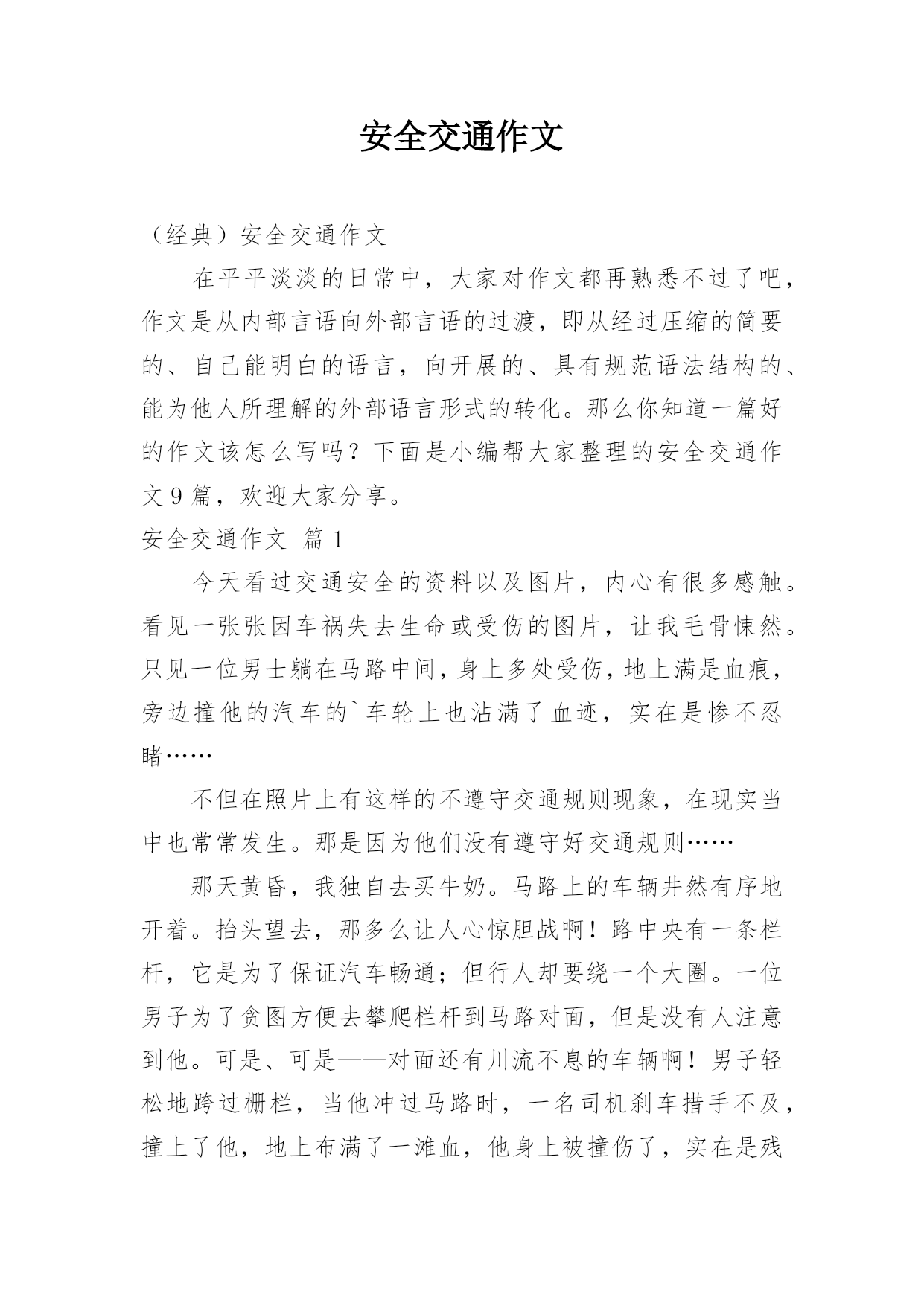 安全交通作文(经典)安全交通作文在平平淡淡的日常中,大家对作文都再熟悉不过了吧,作文是从内部言语向外部言语的过渡,即从经过压缩的简要的、自己能明白的语言,向开展的、具有规范语法结构的、能为他人所理解的外部语言形式的转化。那么你知道一篇好的作文该怎么写吗?下面是小编帮大家整理的安全交通作文9篇,欢迎大家分享。安全交通作文篇1今天看过交通安全的资料以及图片,内心有很多感触。看见一张张因车祸失去生命或受伤的图片,让我毛骨悚然。只见一位男士躺在马路中间,身上多处受伤,地上满是血痕,旁边撞他的汽车的`车轮上也沾满了