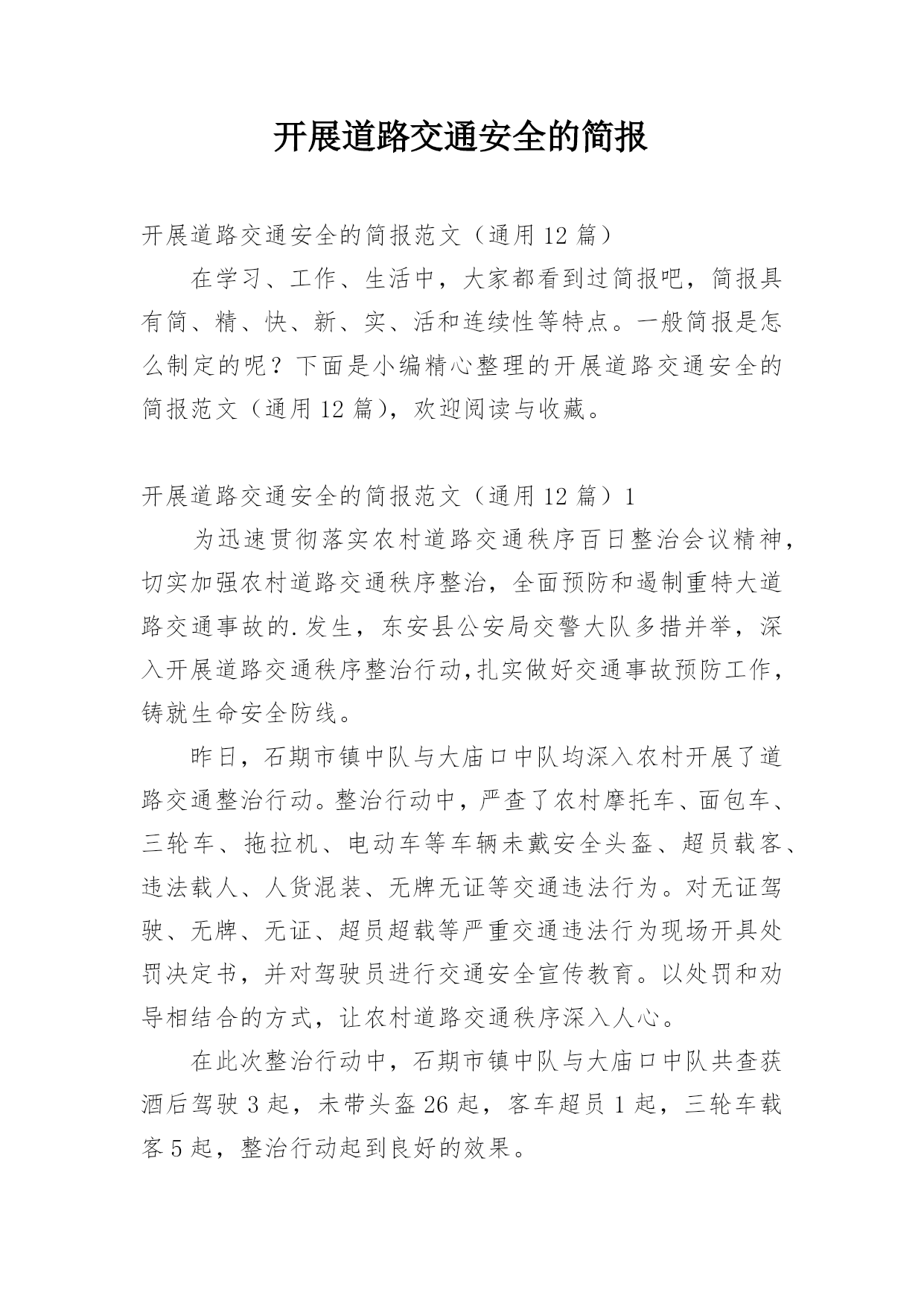 开展道路交通安全的简报开展道路交通安全的简报范文(通用12篇)在学习、工作、生活中,大家都看到过简报吧,简报具有简、精、快、新、实、活和连续性等特点。一般简报是怎么制定的呢?下面是小编精心整理的开展道路交通安全的简报范文(通用12篇),欢迎阅读与收藏。开展道路交通安全的简报范文(通用12篇)1为迅速贯彻落实农村道路交通秩序百日整治会议精神,切实加强农村道路交通秩序整治,全面预防和遏制重特大道路交通事故的.发生,东安县公安局交警大队多措并举,深入开展道路交通秩序整治行动,扎实做好交通事故预防工作,铸就生命安